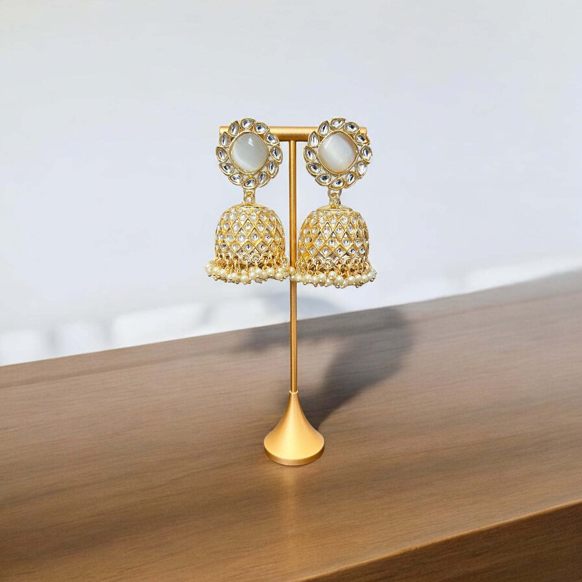 The Mira earrings are a timeless representation of opulence and grace. These gold-plated earrings feature a dazzling kundan round stud at the top, radiating with an ethereal glow. Below, a traditional jhumka dangles, intricately designed with latticework and adorned with small pearl beads that add a subtle shimmer and texture. The earrings measure approximately 2 inches in length, offering just the right amount of elegance and sophistication for bridal or formal events. These earrings bring together classic Indian craftsmanship with a modern touch, making them a versatile addition to any jewelry collection.