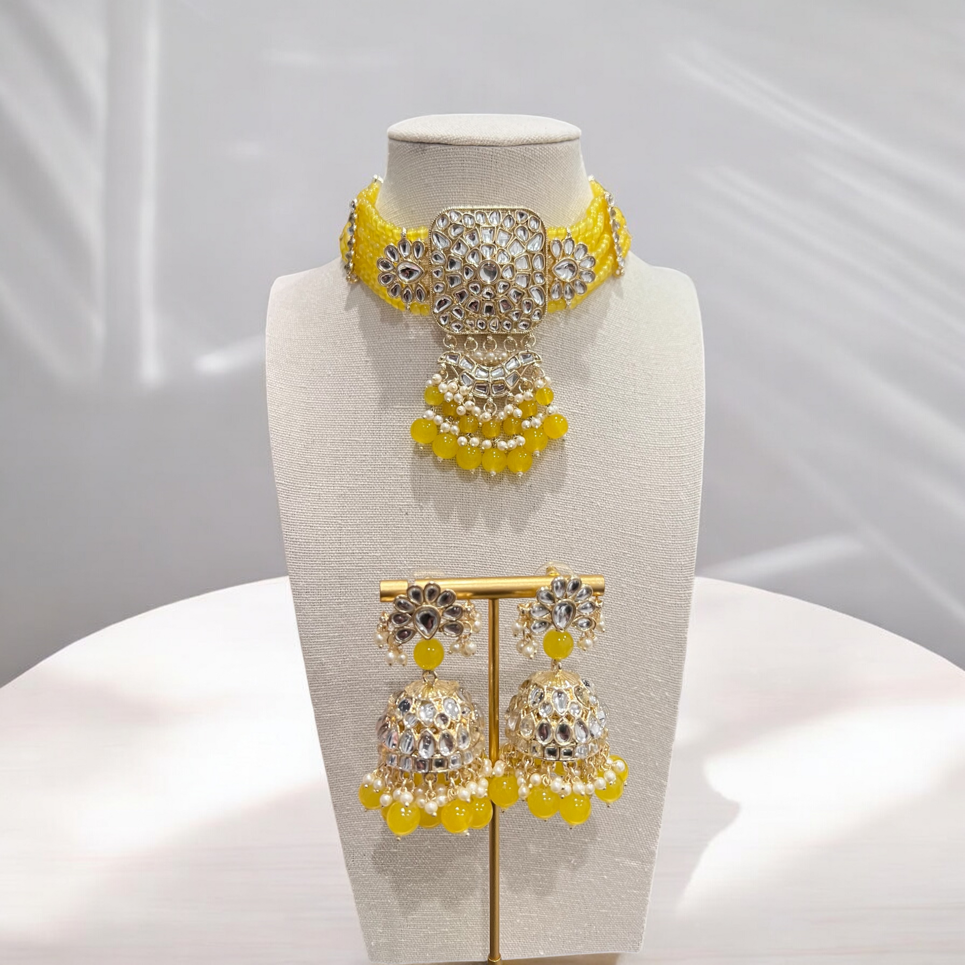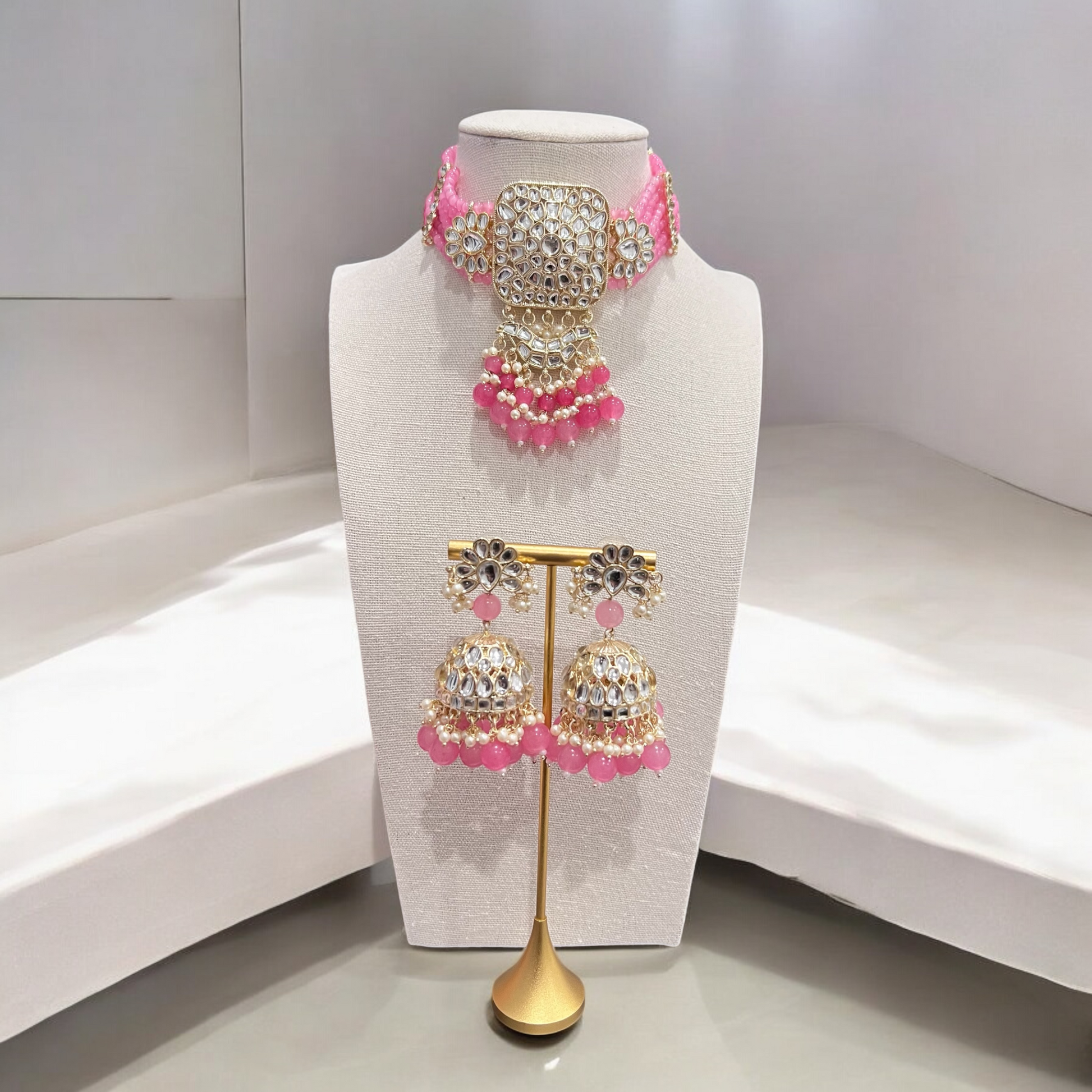 Accompanied by matching earrings, this set completes your look with finesse, featuring intricately crafted jhumkas adorned with beads and kundan stones for a cohesive and glamorous appearance. This set is designed for the modern woman who loves traditional elegance with a contemporary twist.