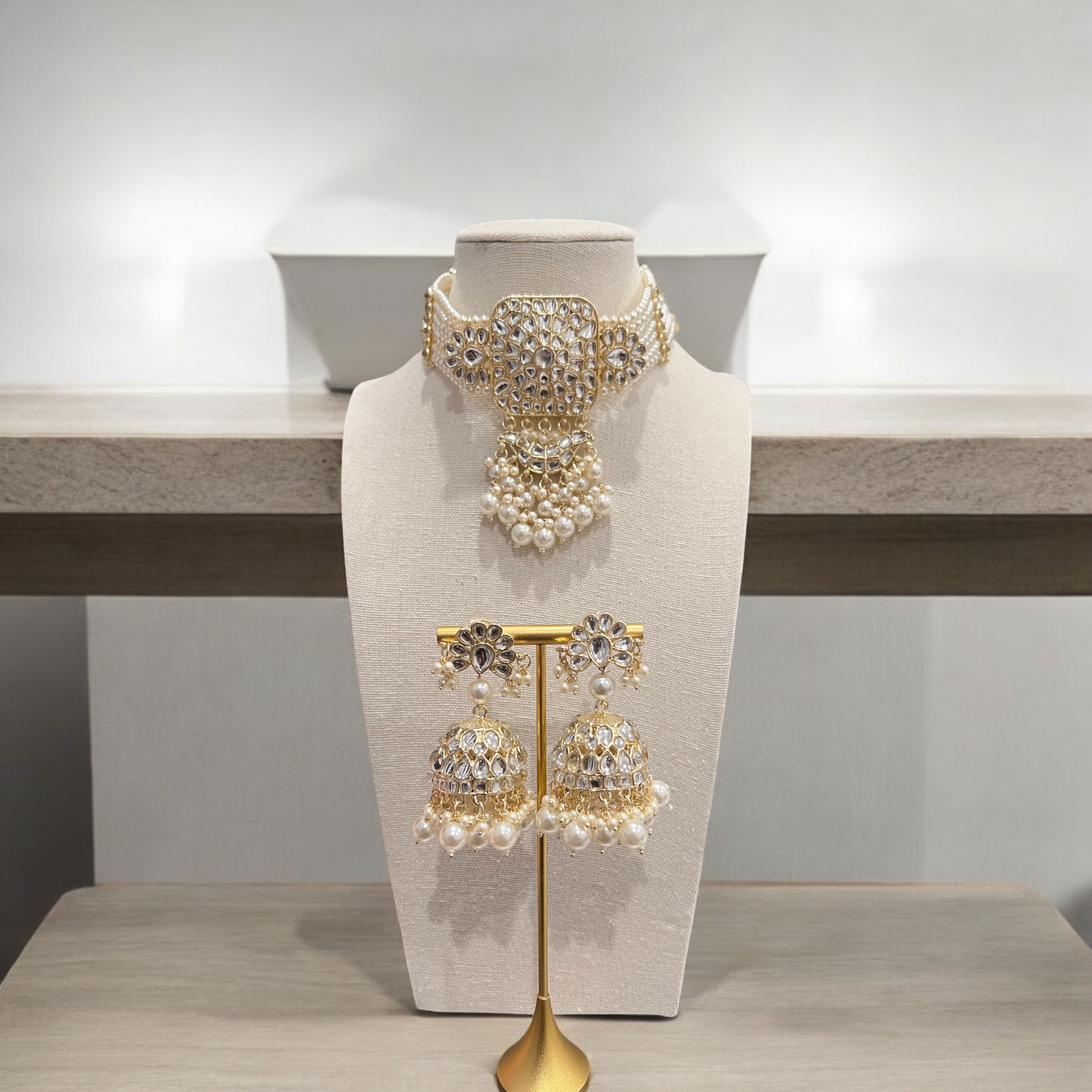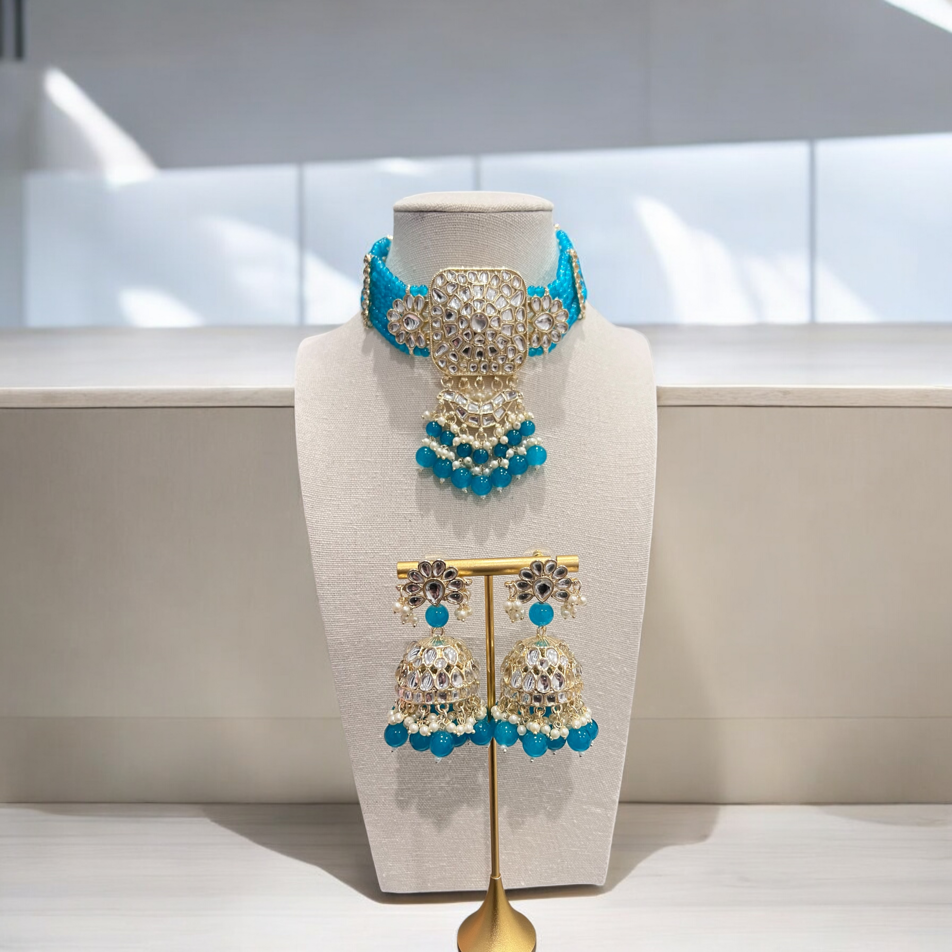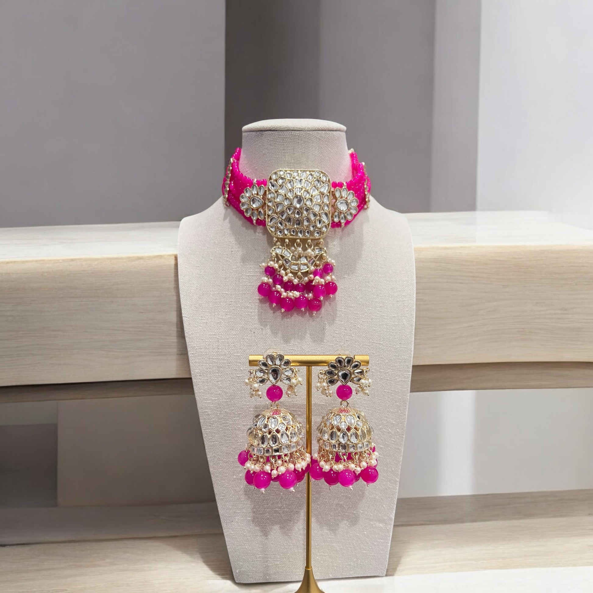 Make a bold statement with this exquisite choker necklace set, perfect for adding a touch of opulence to your special occasions. The choker is meticulously designed with dazzling kundan stones that shimmer with elegance, set against a vibrant beaded band. The intricate detailing of pearls and beads at the pendant adds a regal charm, making it a must-have for any festive ensemble.