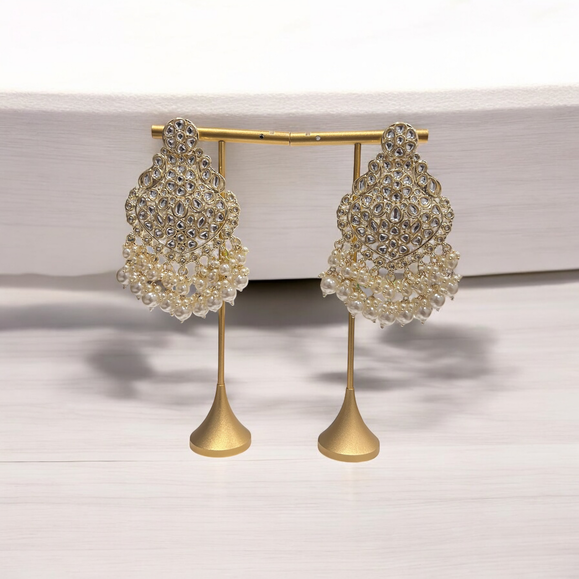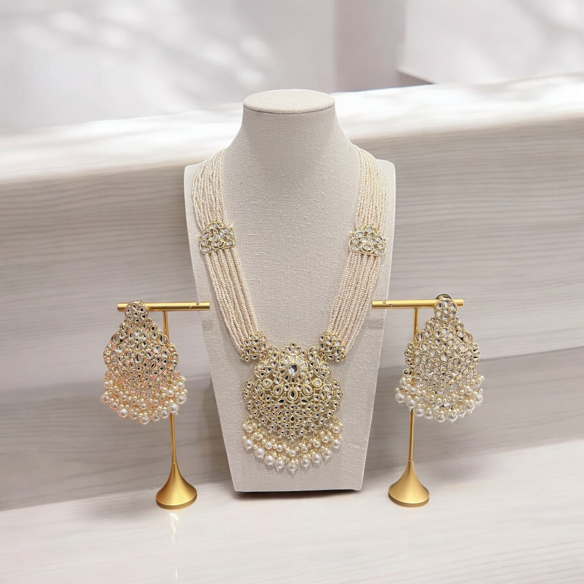 The Inaya necklace set is a statement piece that beautifully blends pearls and kundan stones in a regal design. The necklace features multiple strands of small pearls, intricately woven together to form a collar-like design that rests gracefully on the neck. At its center is a gold-plated pendant adorned with sparkling kundan stones and surrounded by pearls. The matching earrings, each measuring ~2.75 inches, add balance to the set with their dome-shaped jhumka design. This set is perfect for weddings, festive occasions, or any event where you want to channel timeless elegance.