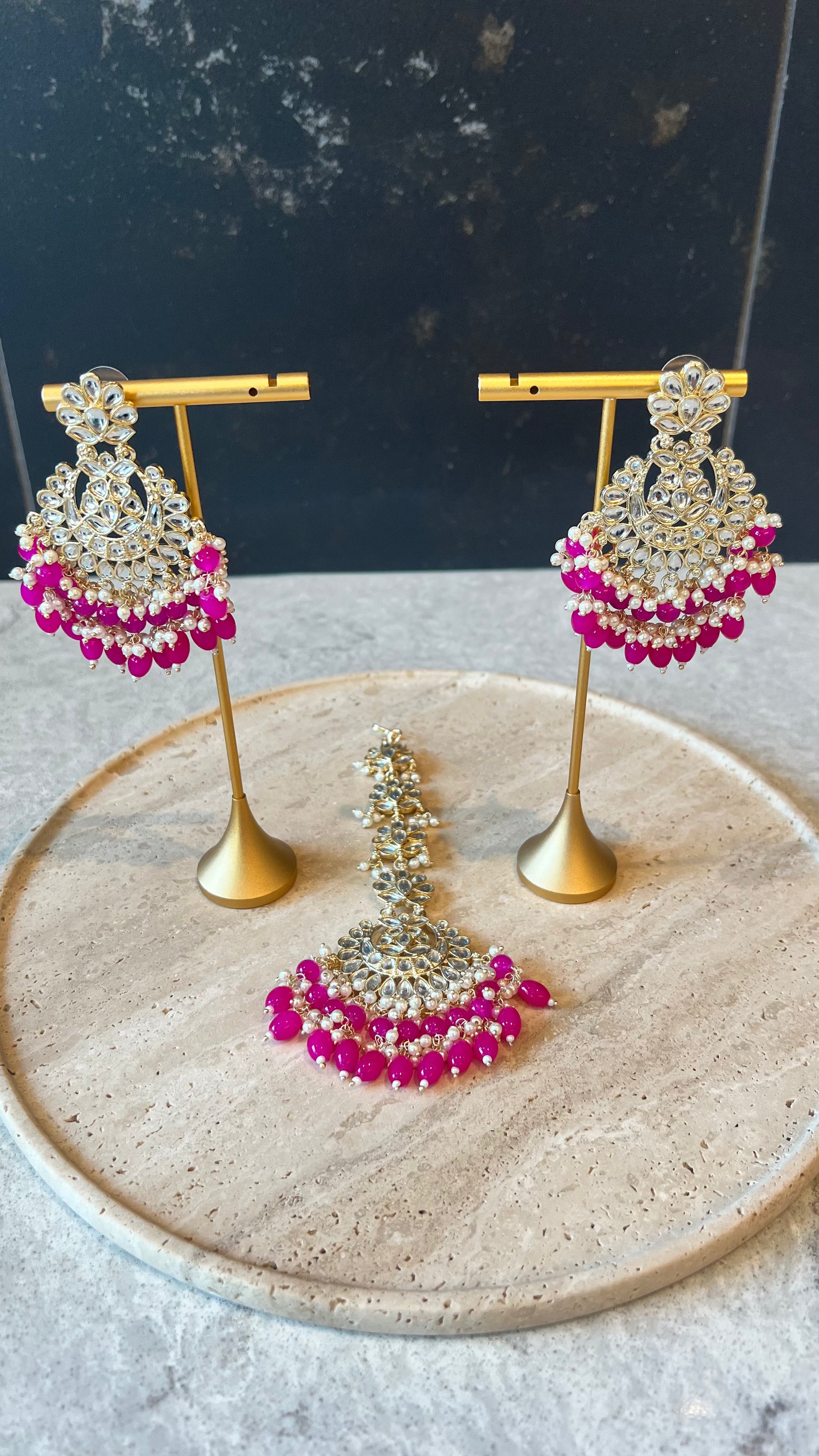 The Kaya Set is an elegant combination of statement earrings and a teeka, perfect for special occasions. The earrings feature a delicate kundan design, adorned with pearls and soft pink beads, while the matching teeka adds a touch of traditional elegance. Measuring 2.5 inches in length, the earrings are designed to complement both traditional and modern-desi attire.