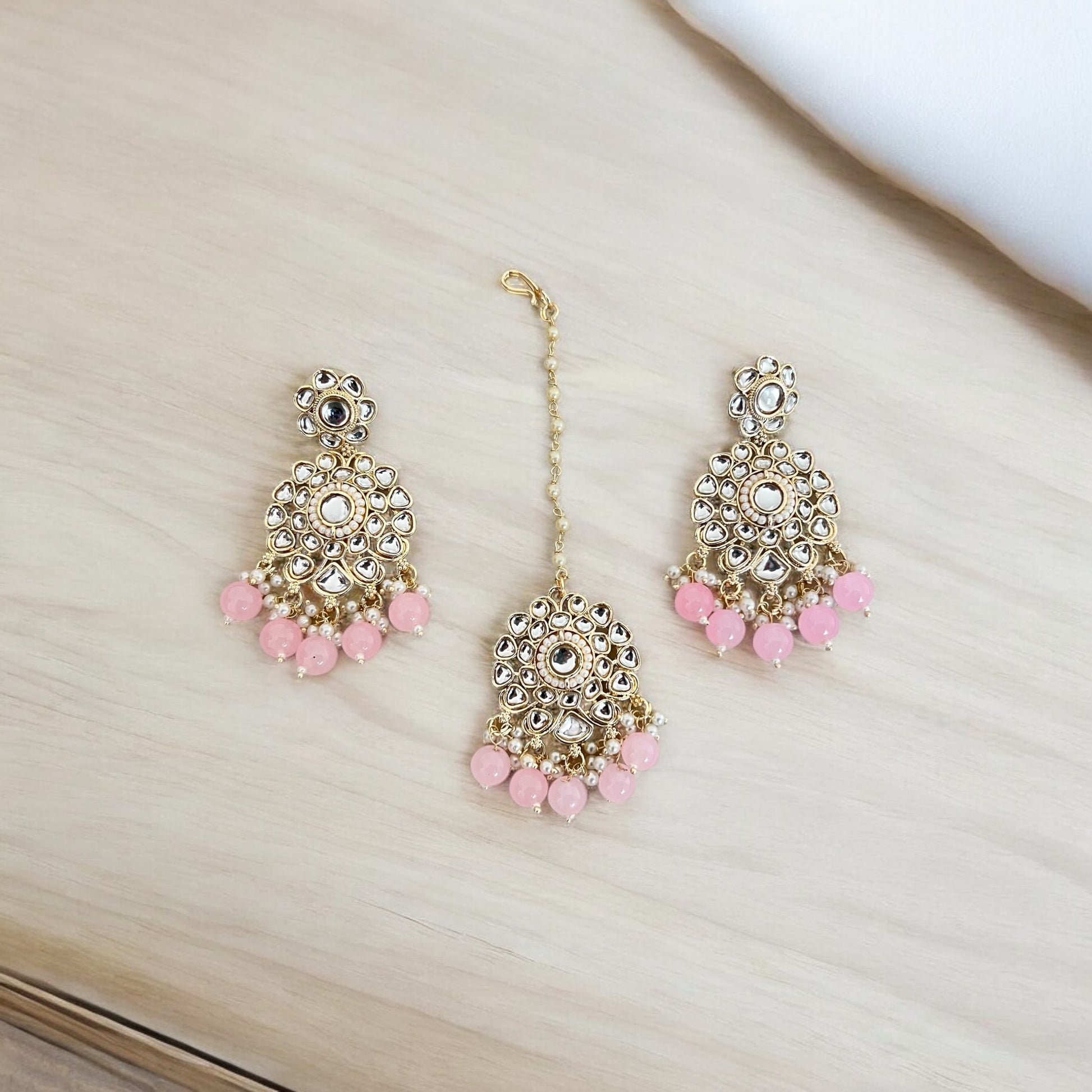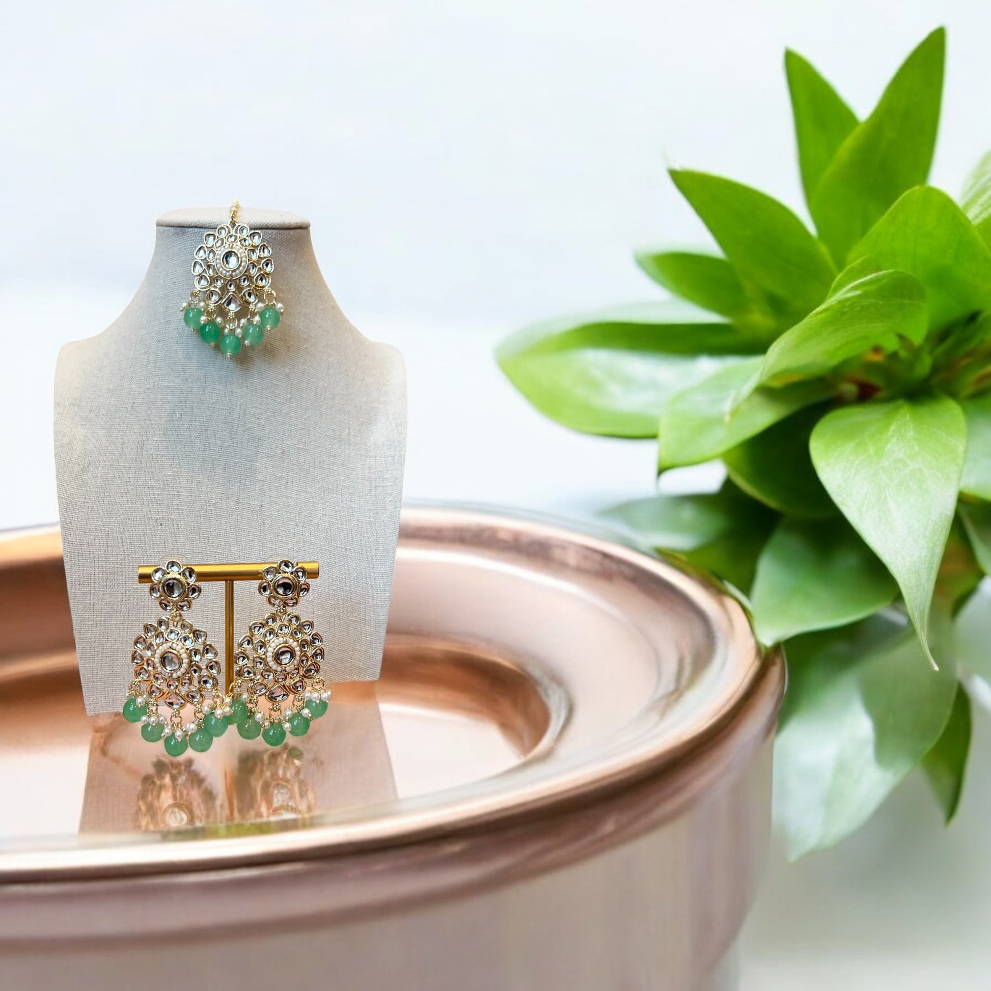 The Azirah earrings and teeka set is a perfect blend of elegance and charm, featuring delicate beads and glistening kundan stones. The earrings, measuring ~2.5 inches, have a traditional jhumka shape adorned with intricate detailing, while the teeka complements the look with its dainty design. This set is ideal for anyone looking for a soft, feminine touch to their ensemble. The colors and gold tones create a harmonious balance, making this set a versatile and elegant choice for various traditional events.