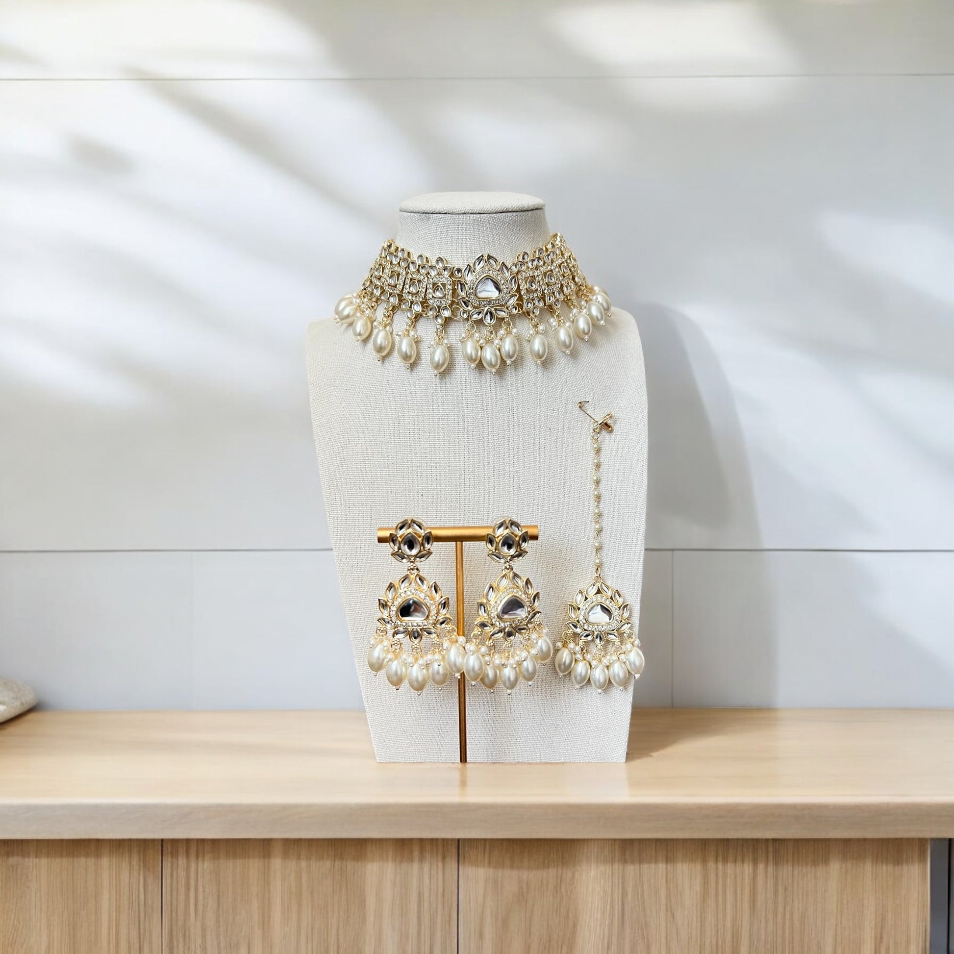 The Shirina Necklace Set features an ornate choker-style necklace embellished with kundan stones and oversized pearls. The intricate gold-plated design is elevated with teardrop-shaped pearls that add a touch of grandeur and elegance. Accompanied by matching jhumka earrings and a teeka, this set is perfect for anyone that has a special occasion. The choker sits beautifully, creating a balanced and luxurious look. Ideal for those who want to add a regal touch to their ensemble, this set ensures you make a lasting impression.