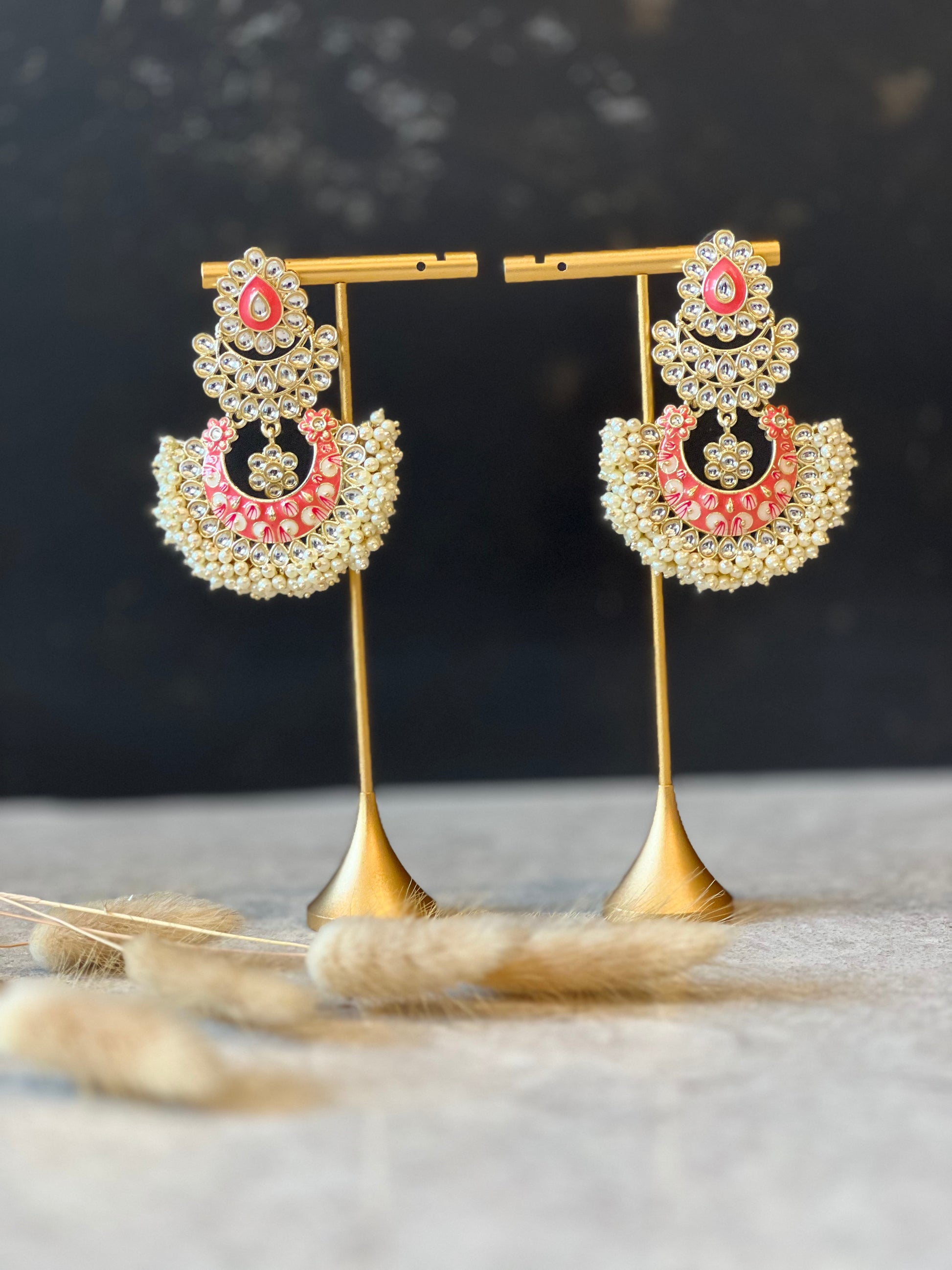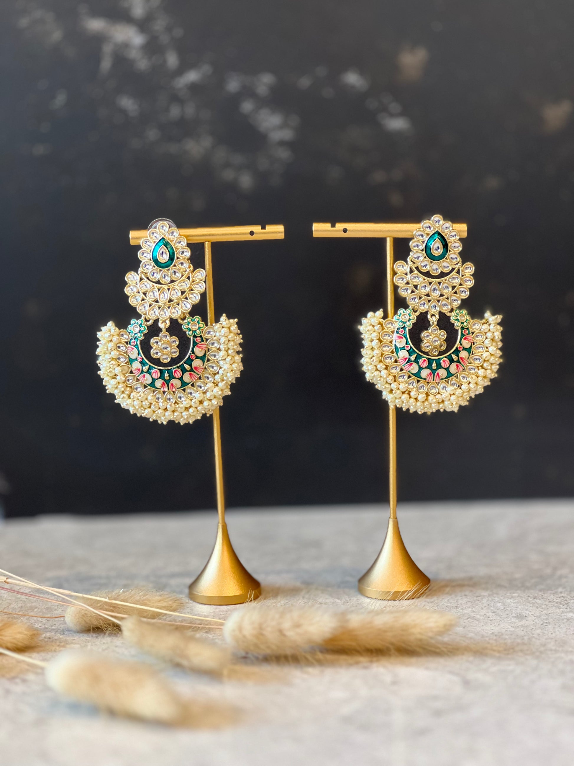 The Kira Earrings exude a perfect blend of modern elegance and traditional charm. These stunning earrings feature an intricate kundan and pearl-studded design, finished with rich bead accents. The chandelier-style drop, adorned with cascading pearls and green beads, adds movement and sophistication to the earrings. Ideal for festive occasions, these earrings beautifully complement traditional attire, while the striking Meenakari enamel detailing at the top adds a unique and artistic touch.
