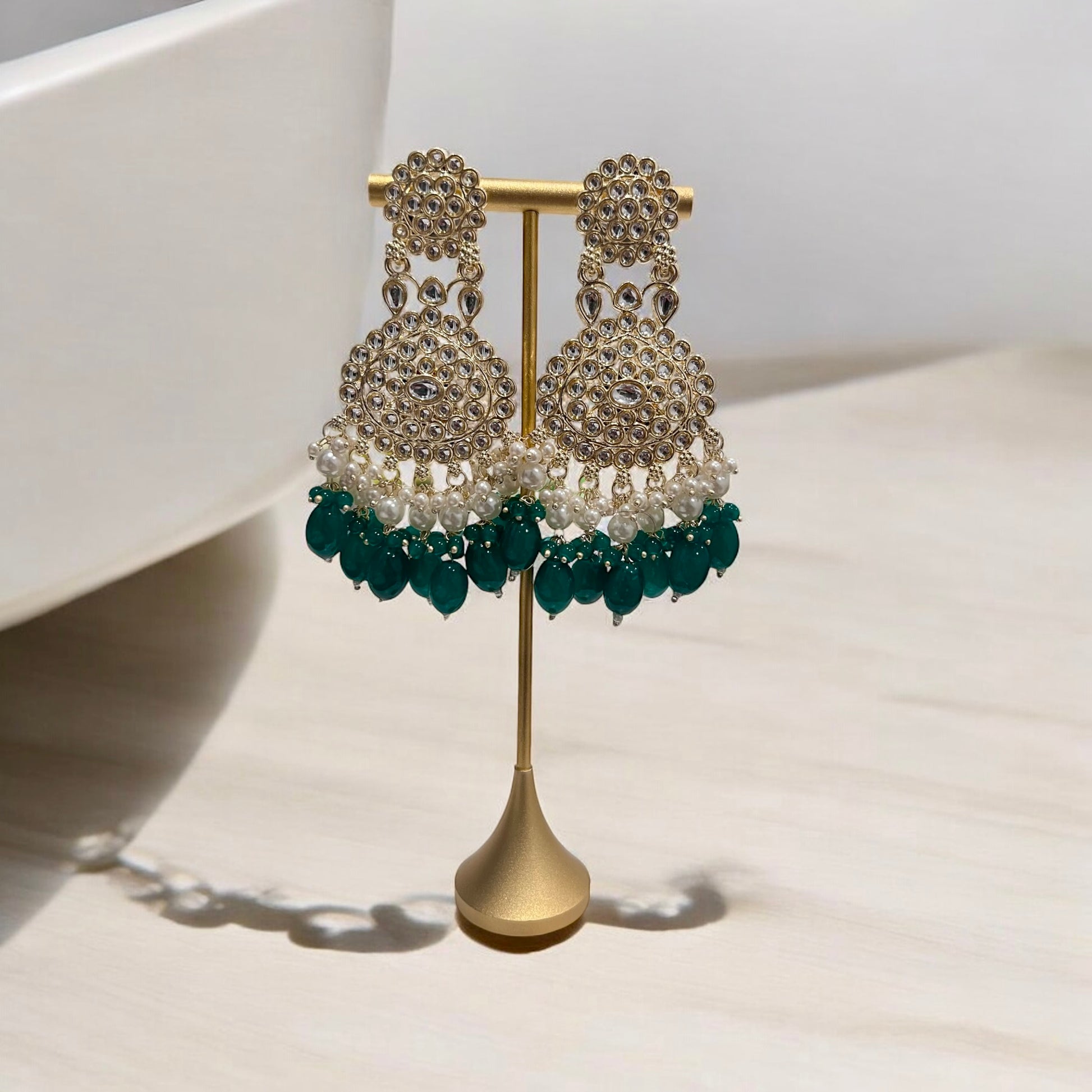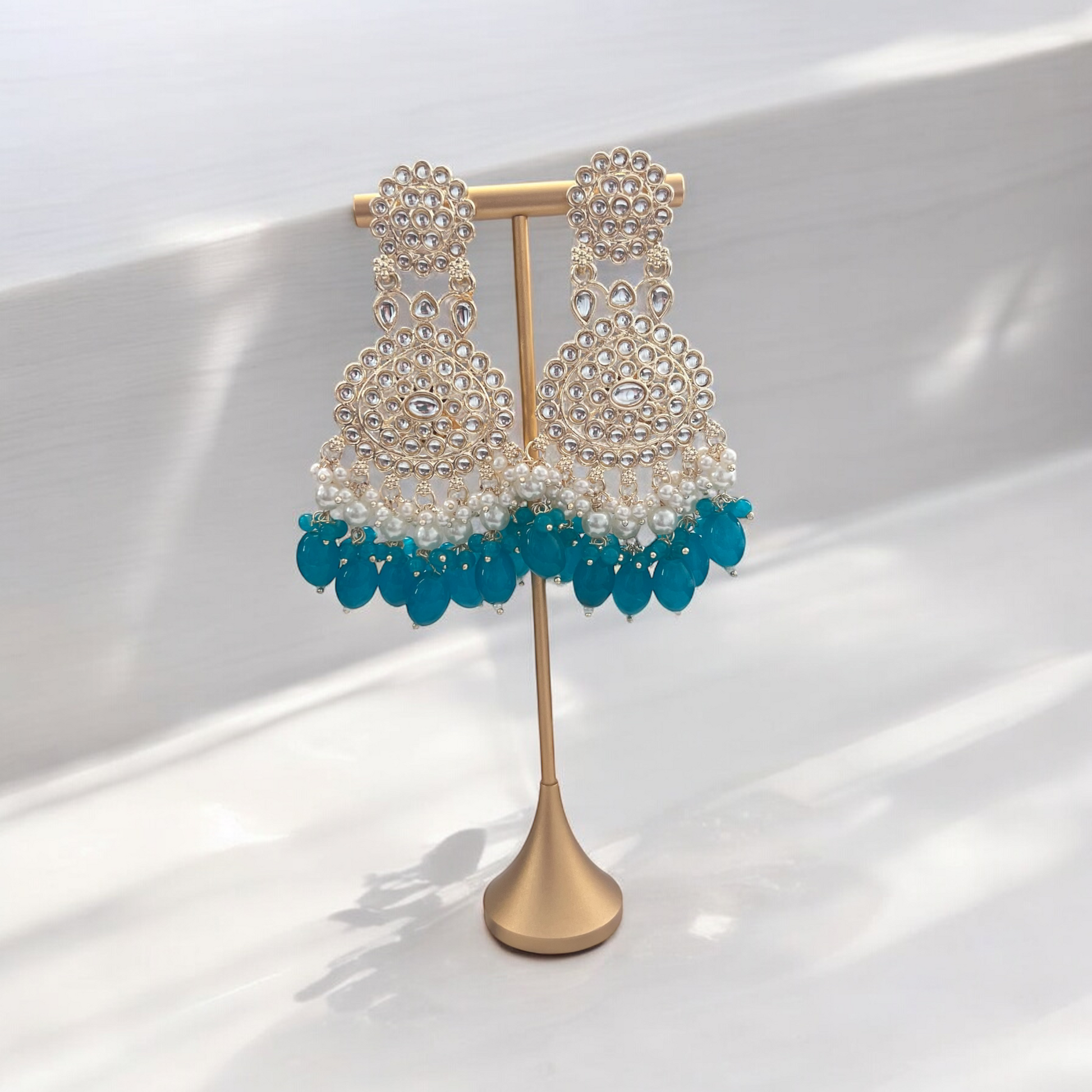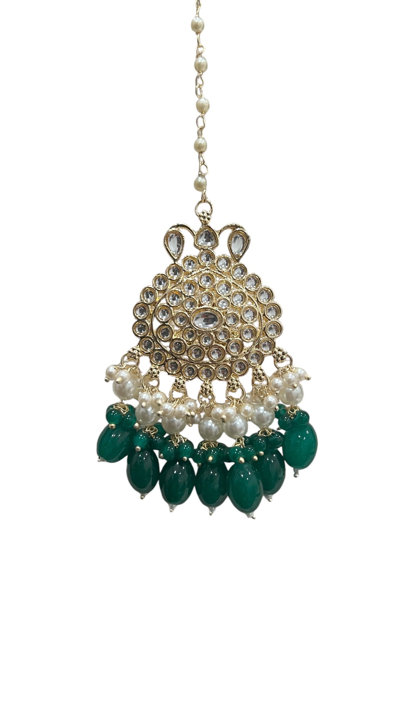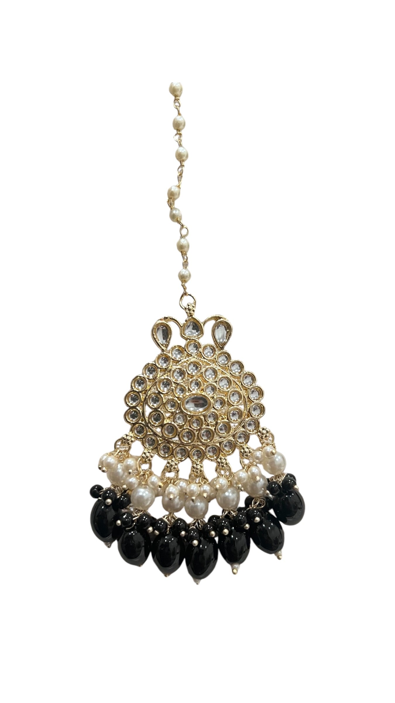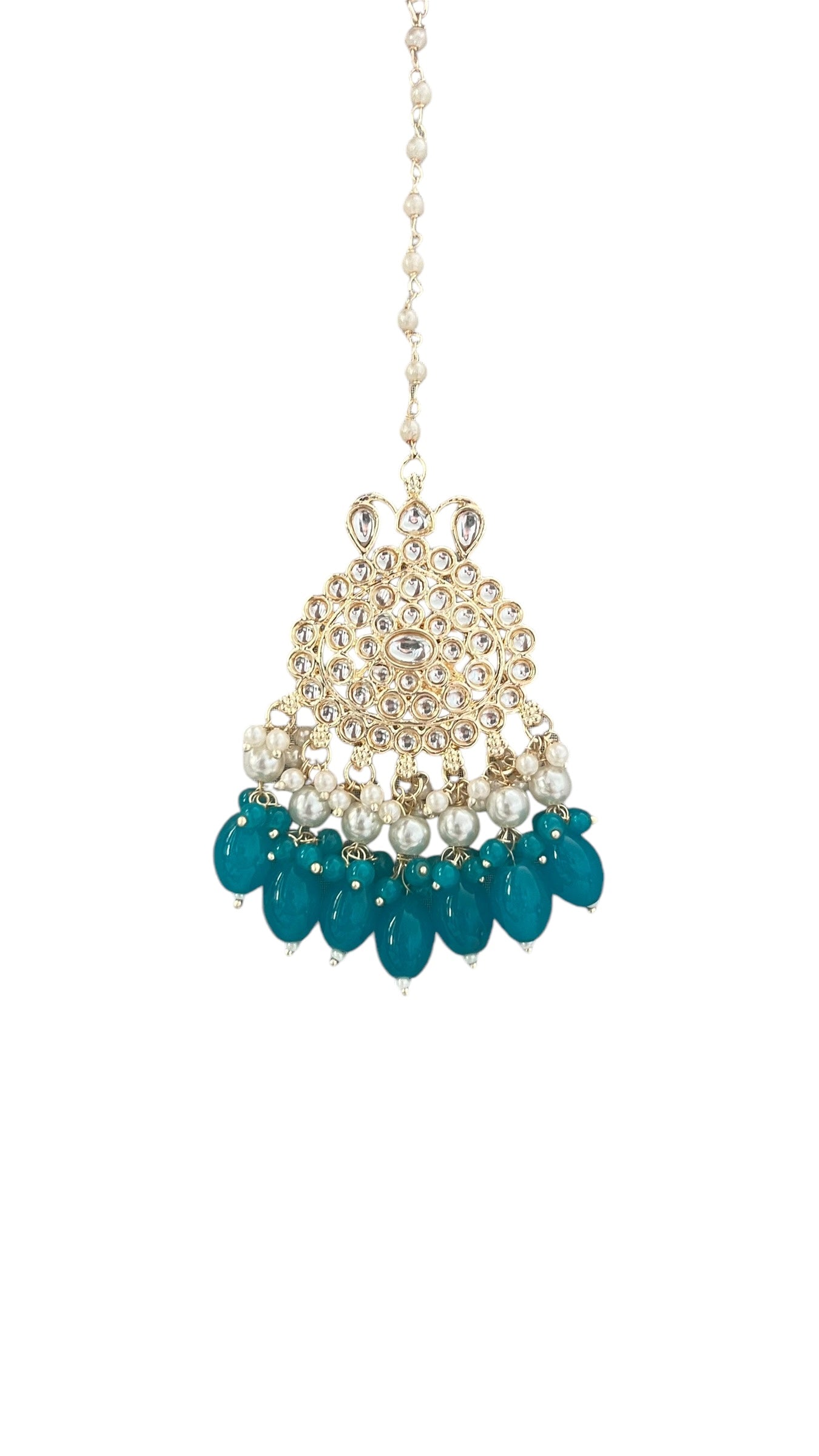 The Saphira Set is a striking piece featuring luxurious colors and gold tones. The earrings are designed with intricate kundan detailing, finished with delicate pearls and beads, giving them a sophisticated and modern look. The matching teeka completes the set, offering a traditional touch to the overall design. The earrings are perfect for formal occasions or party wear, adding a regal and elegant touch to any ensemble.