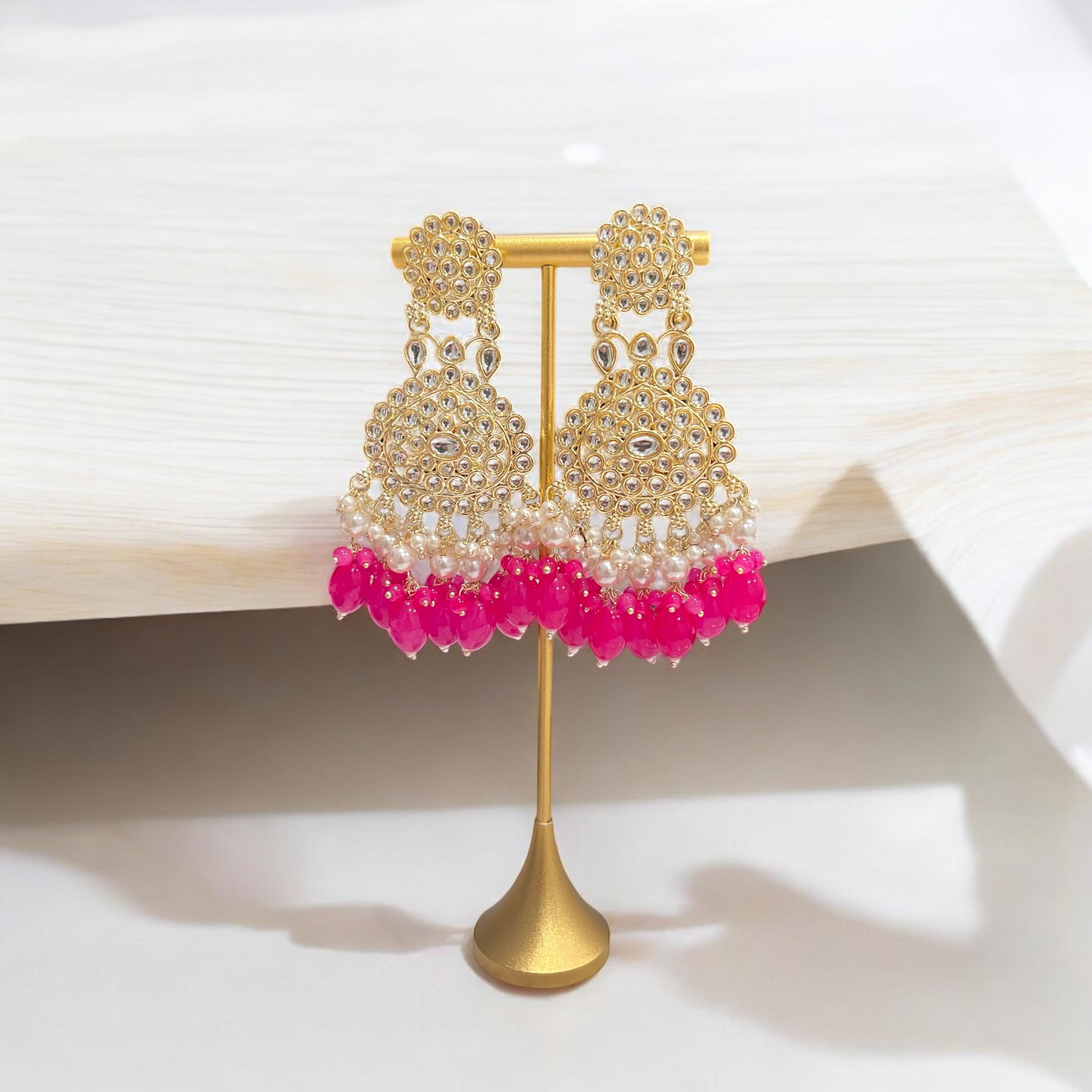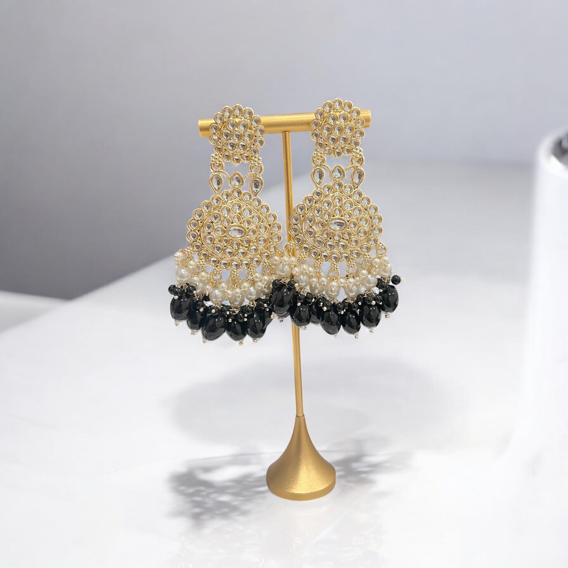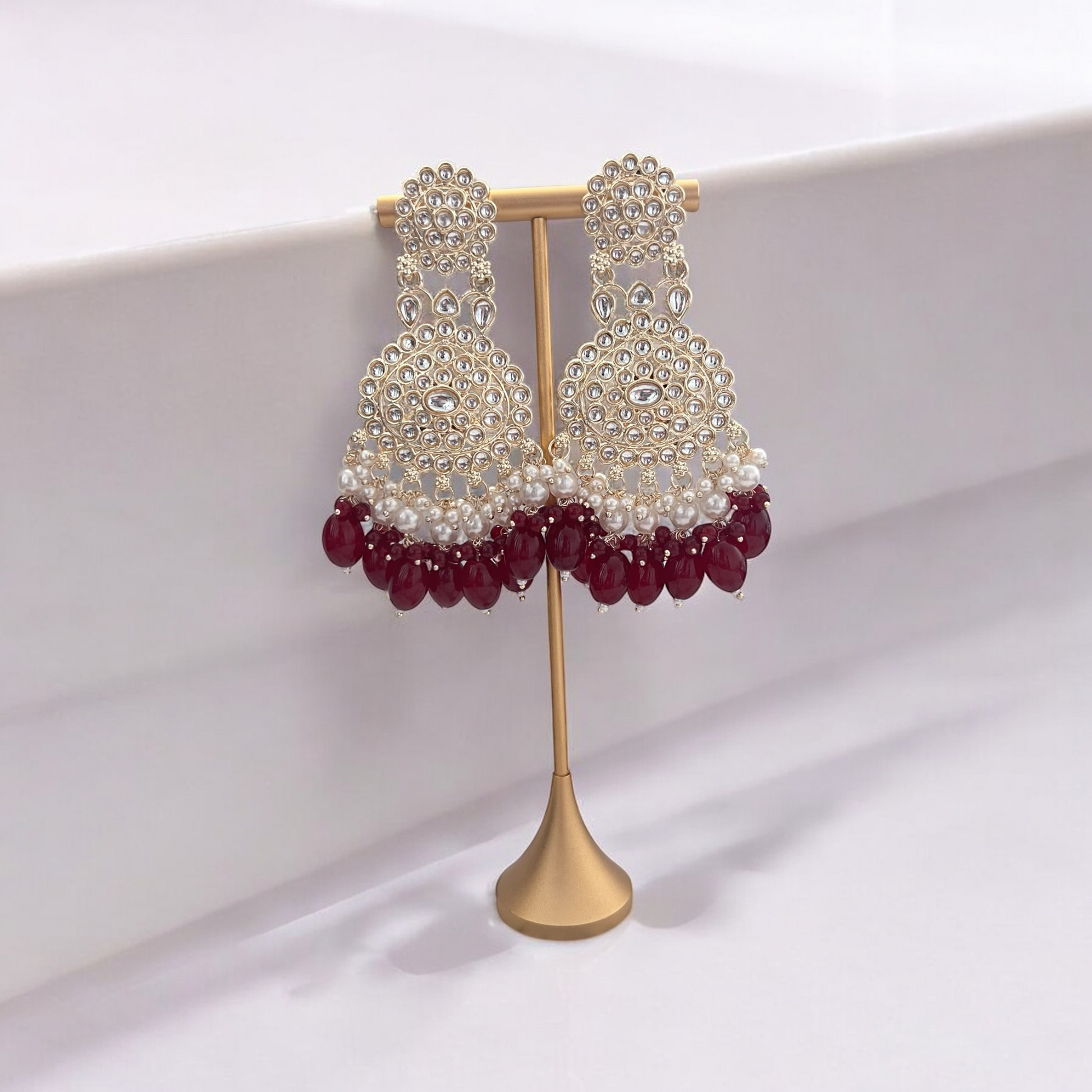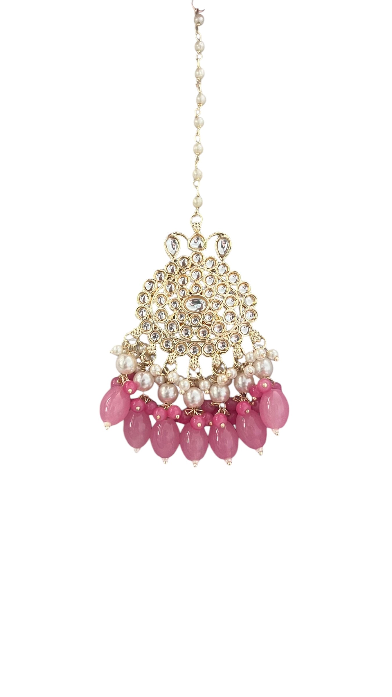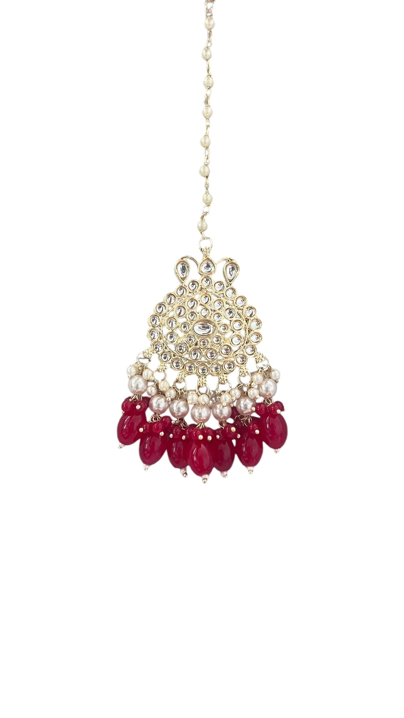 The Saphira Set is a striking piece featuring luxurious colors and gold tones. The earrings are designed with intricate kundan detailing, finished with delicate pearls and beads, giving them a sophisticated and modern look. The matching teeka completes the set, offering a traditional touch to the overall design. The earrings are perfect for formal occasions or party wear, adding a regal and elegant touch to any ensemble.