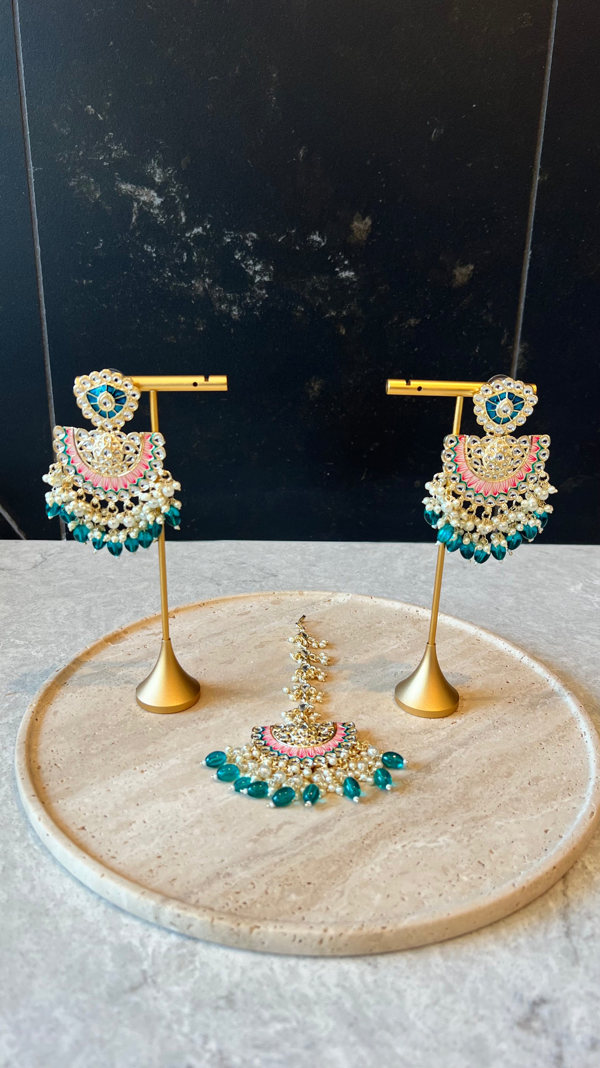 The Niralyn Set is a captivating blend of intricate design and vibrant color. This set features statement earrings adorned with pearls and rich beads, creating a luxurious contrast. The matching teeka completes the traditional look, offering a balanced and elegant appeal. With a ~3-inch drop, the earrings are perfect for anyone looking to add a bold yet elegant touch to their outfit. The detailed craftsmanship and use of faux stones and beads make this set ideal for festive occasions or weddings.