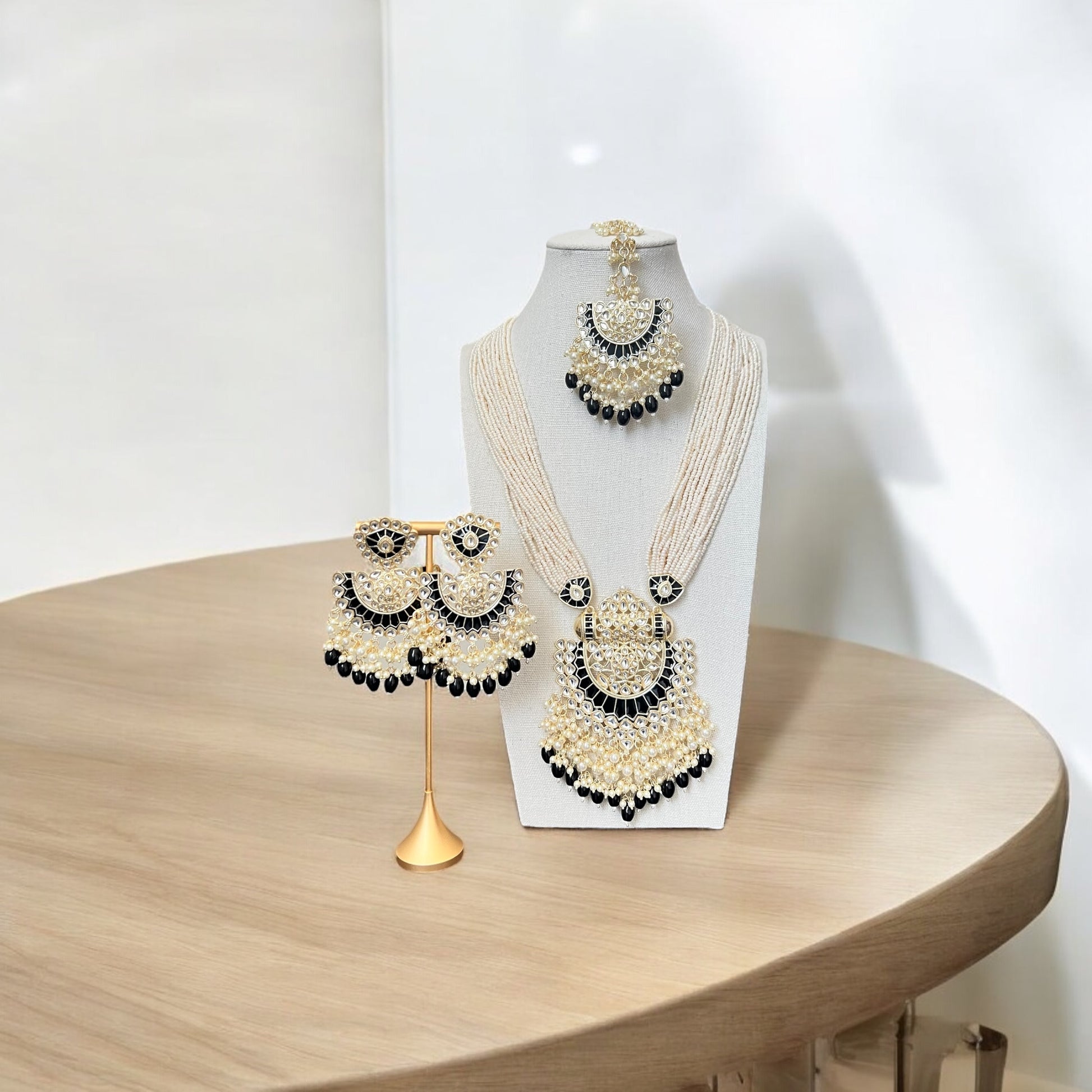 The Kaliyani Necklace Set is a luxurious, multi-layered pearl necklace with a striking kundan-studded pendant as its centerpiece. Each layer of pearls is intricately strung to create an elegant drape along the neckline. The set is completed with matching earrings featuring a ~3-inch drop, designed to mirror the necklace's intricate kundan and pearl detailing. The cascading faux pearls from the pendant and earrings add a touch of opulence, making this set ideal for weddings and festive occasions. Perfect for anyone looking to make a statement, the Kaliyani Set beautifully blends traditional craftsmanship with modern elegance.