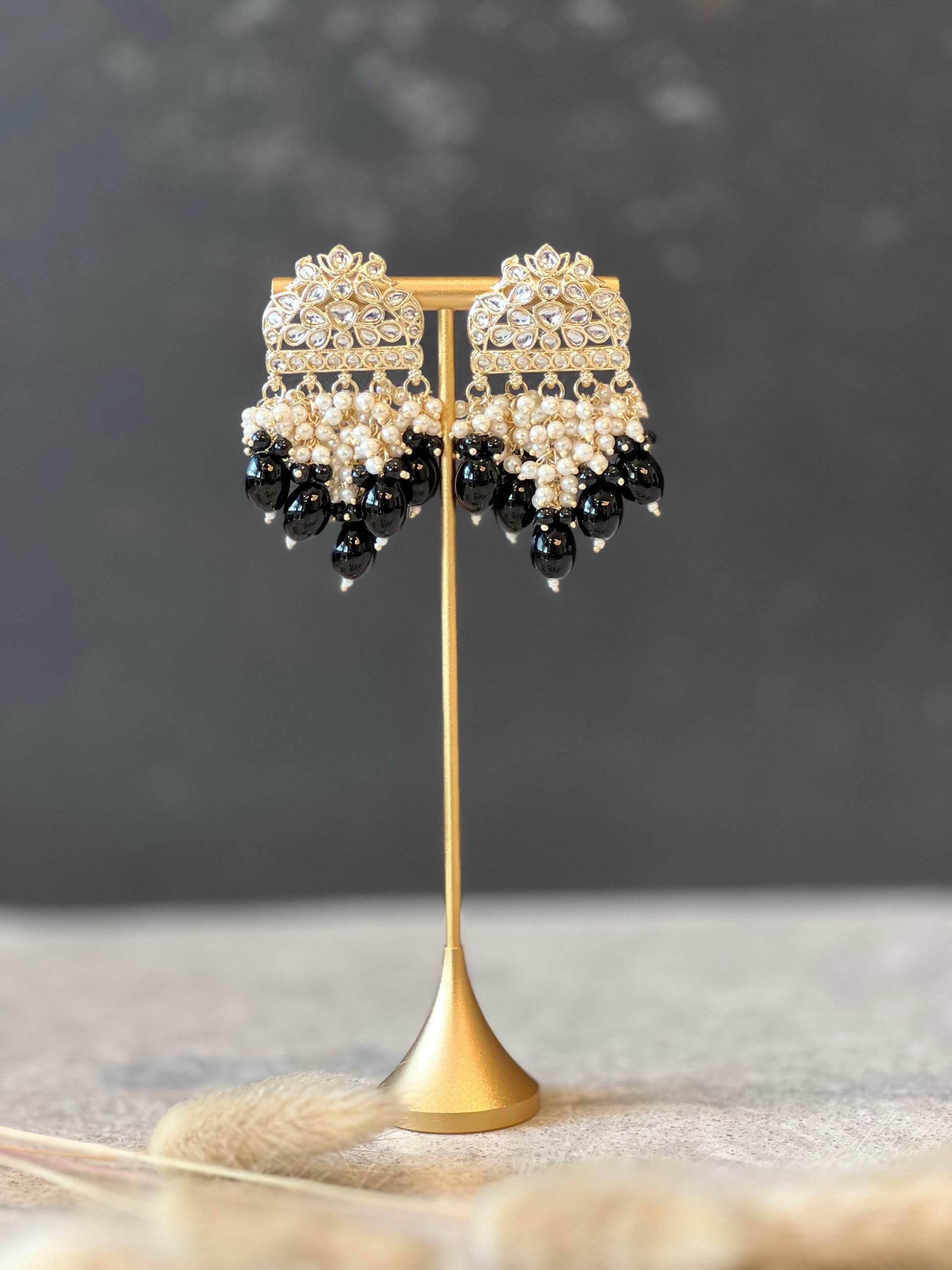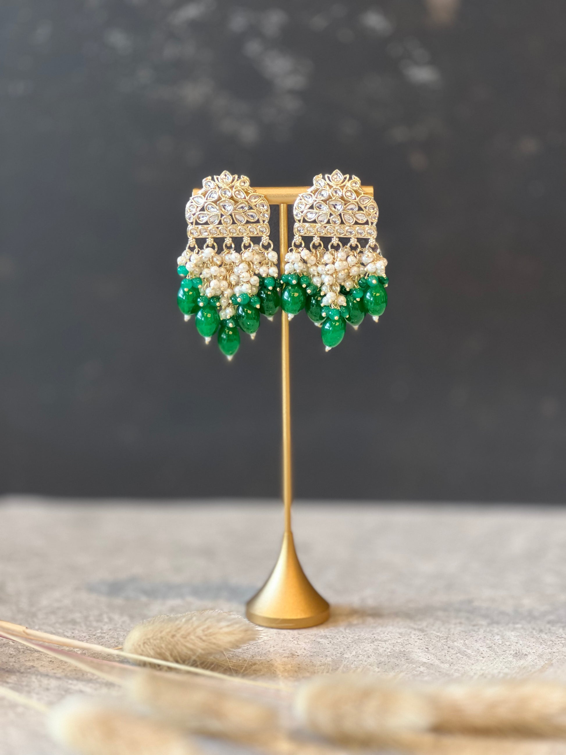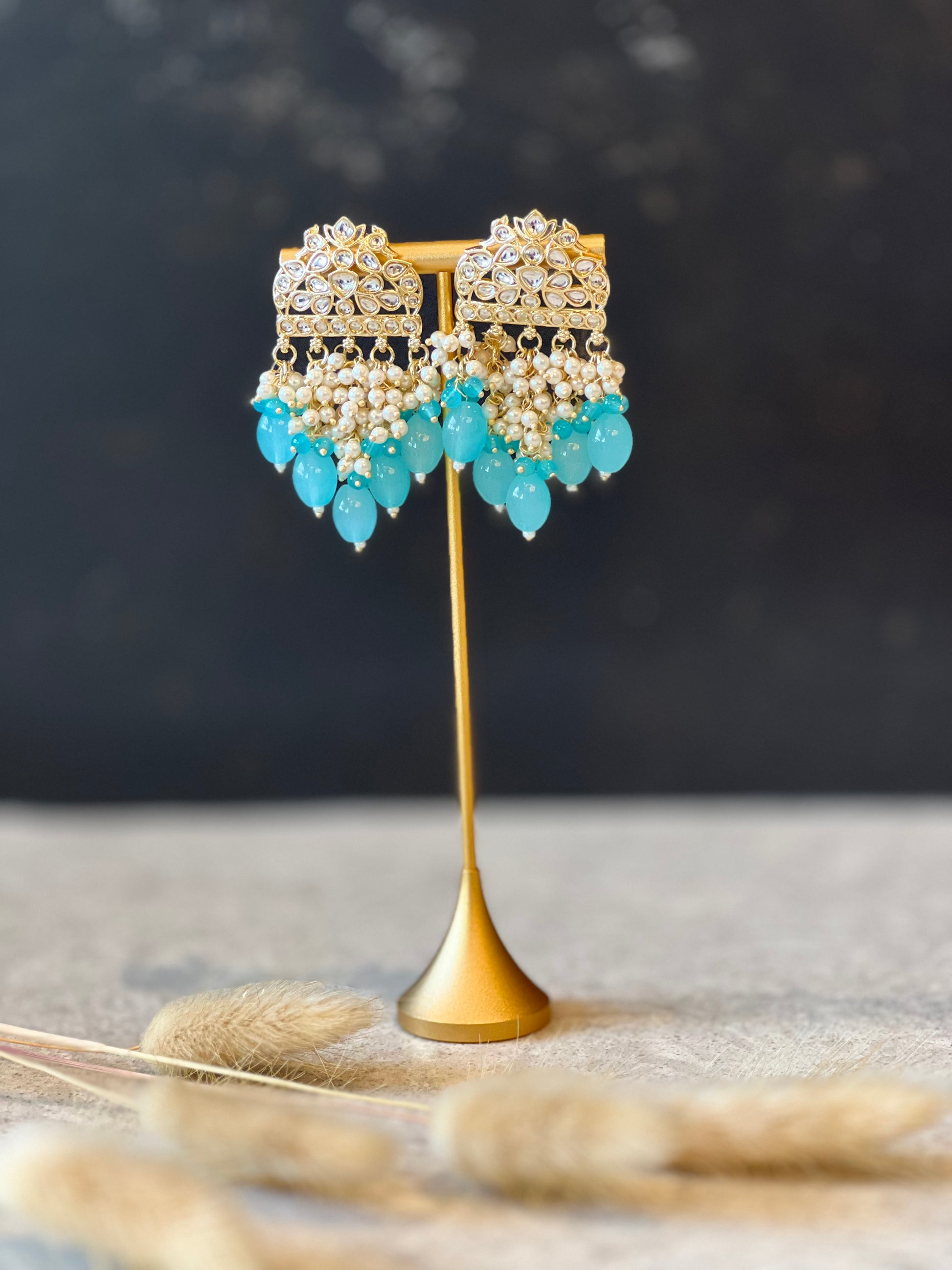The Fayrah Earrings are designed to capture attention with their stunning mix of kundan stones and delicate detailing. Featuring a round kundan-studded top with a cascading chandelier design, these earrings are further embellished with pearls. Measuring about 2.3 inches, they are ideal for festive occasions or party wear, adding a touch of regal elegance to any outfit.