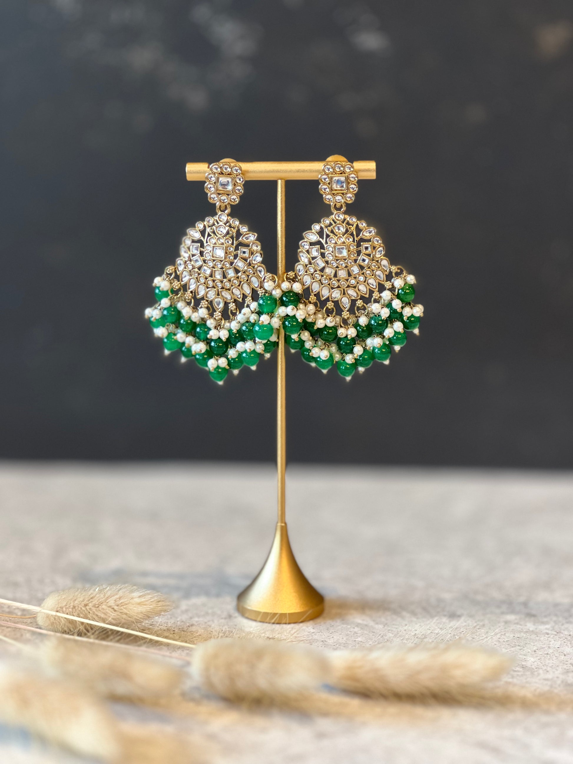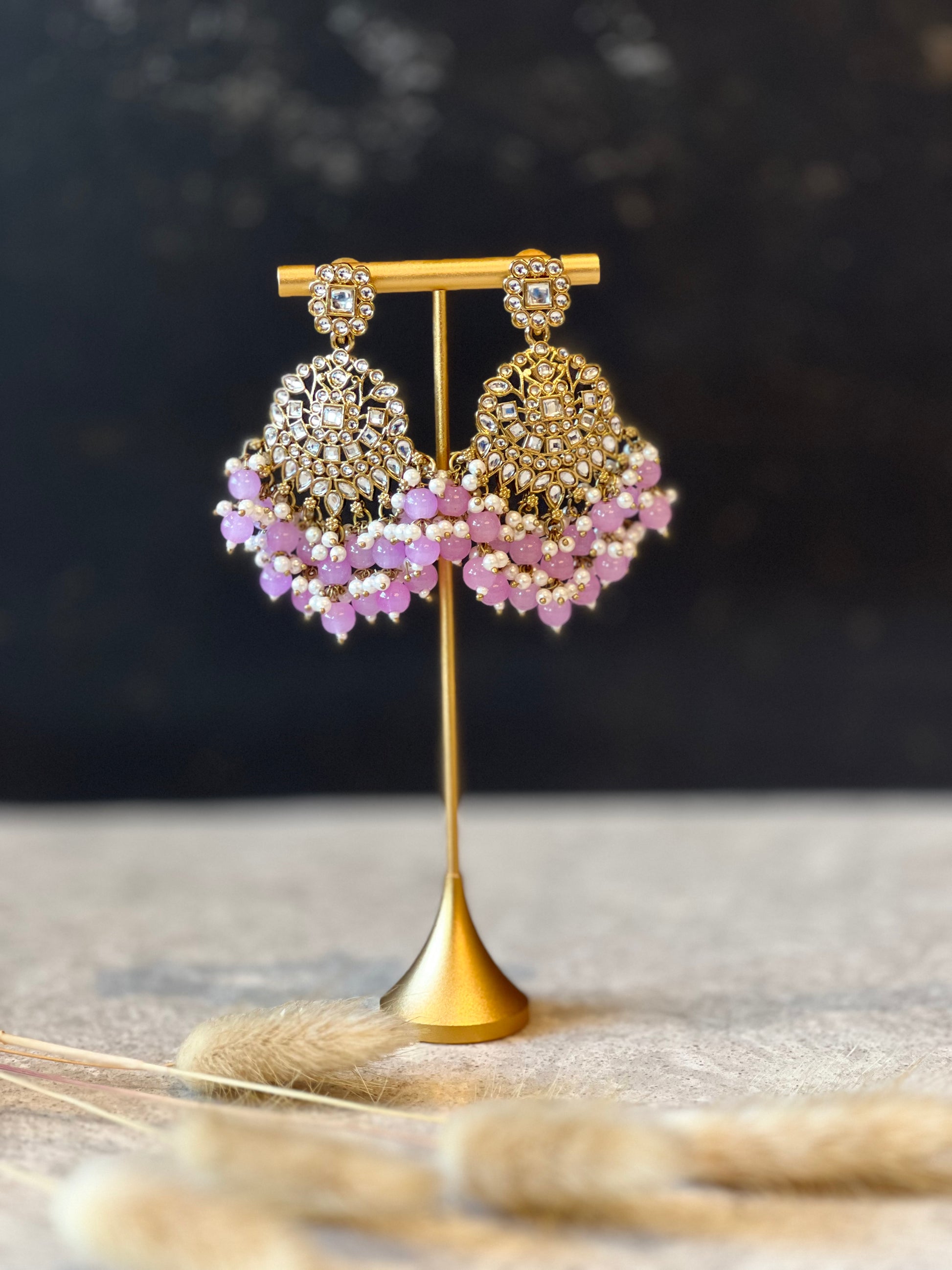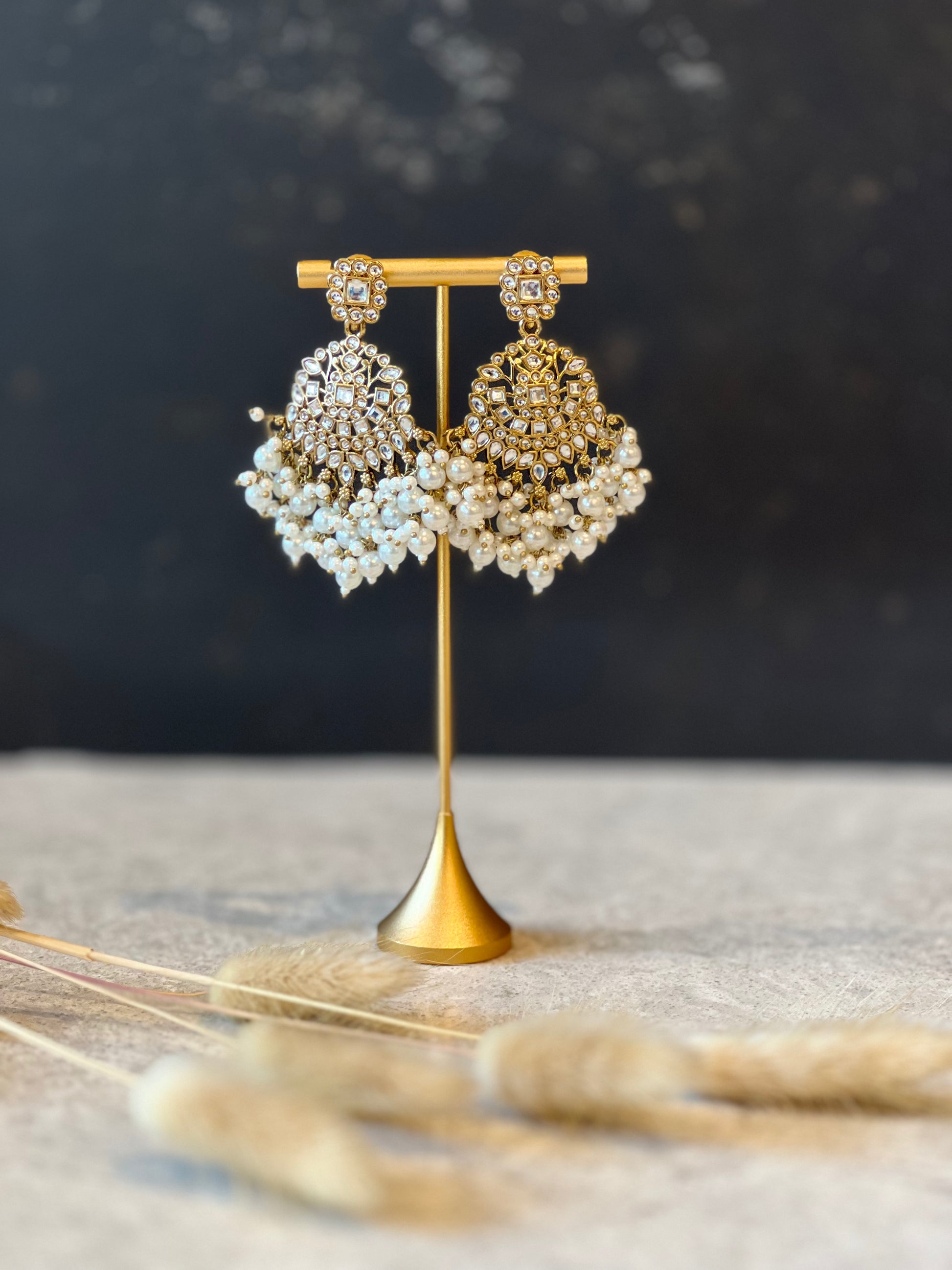 The Inarza Earrings are an artistic take on traditional jhumkas, featuring a kundan-studded base with a central jhumka design. The jhumkas are adorned with delicate teardrop pearls, adding grace and movement. Measuring about 2.7 inches, these earrings are ideal for parties or formal events, offering a sophisticated yet modern look.