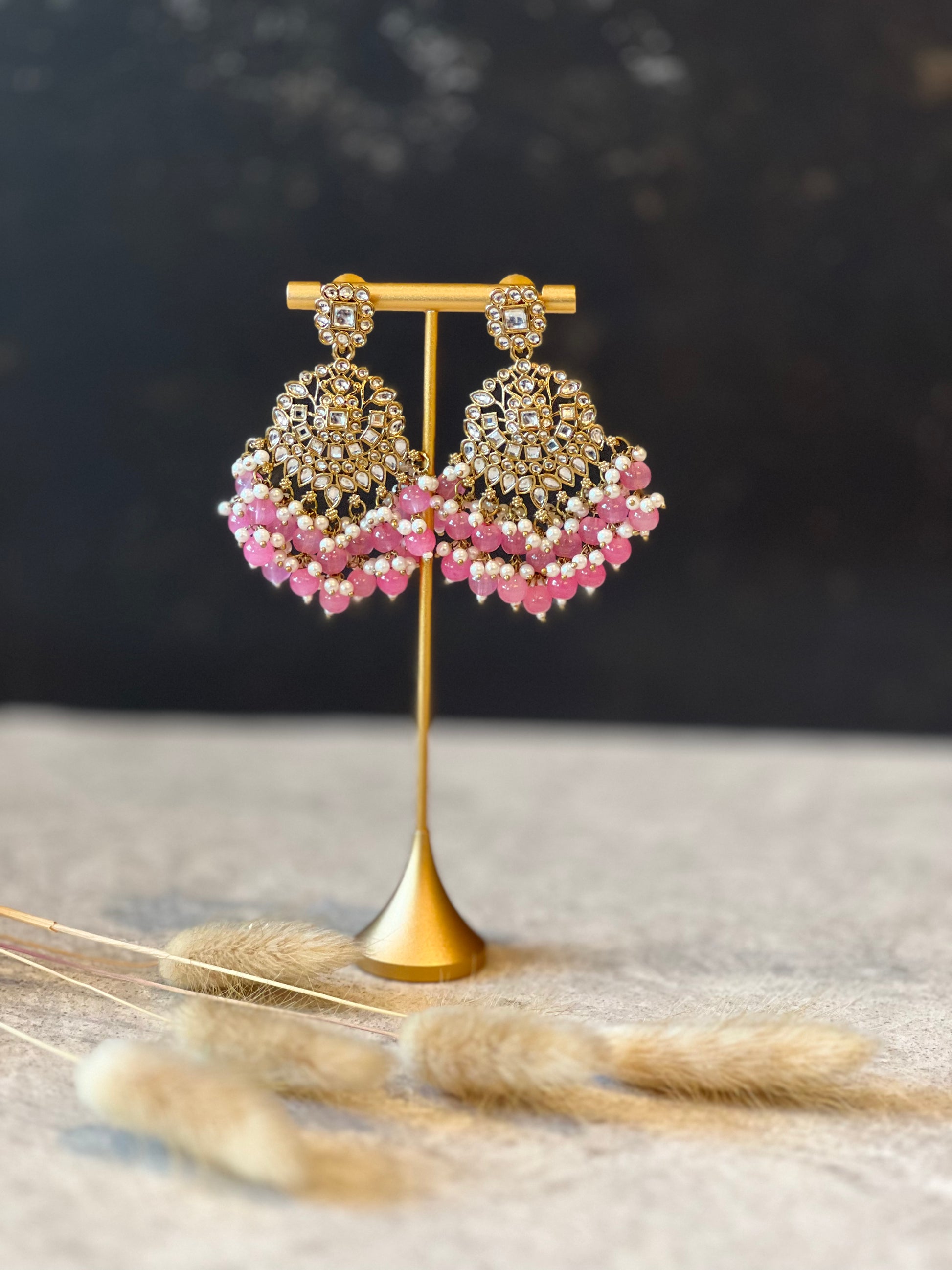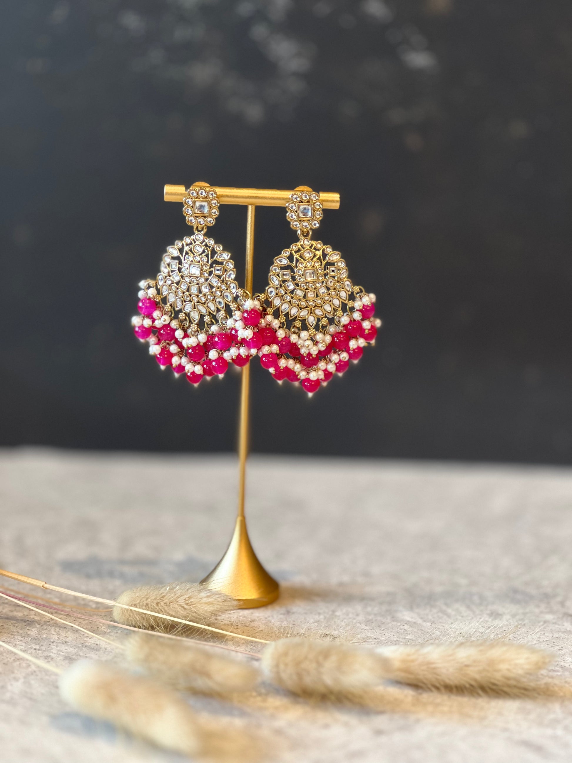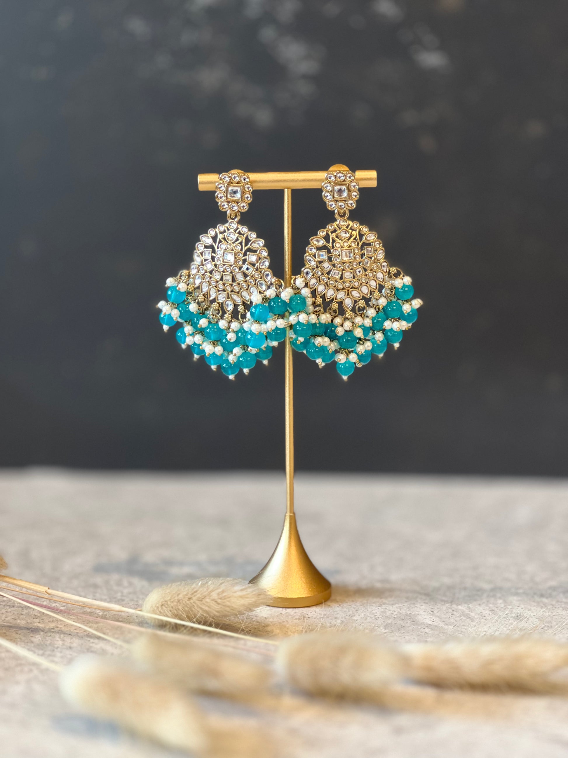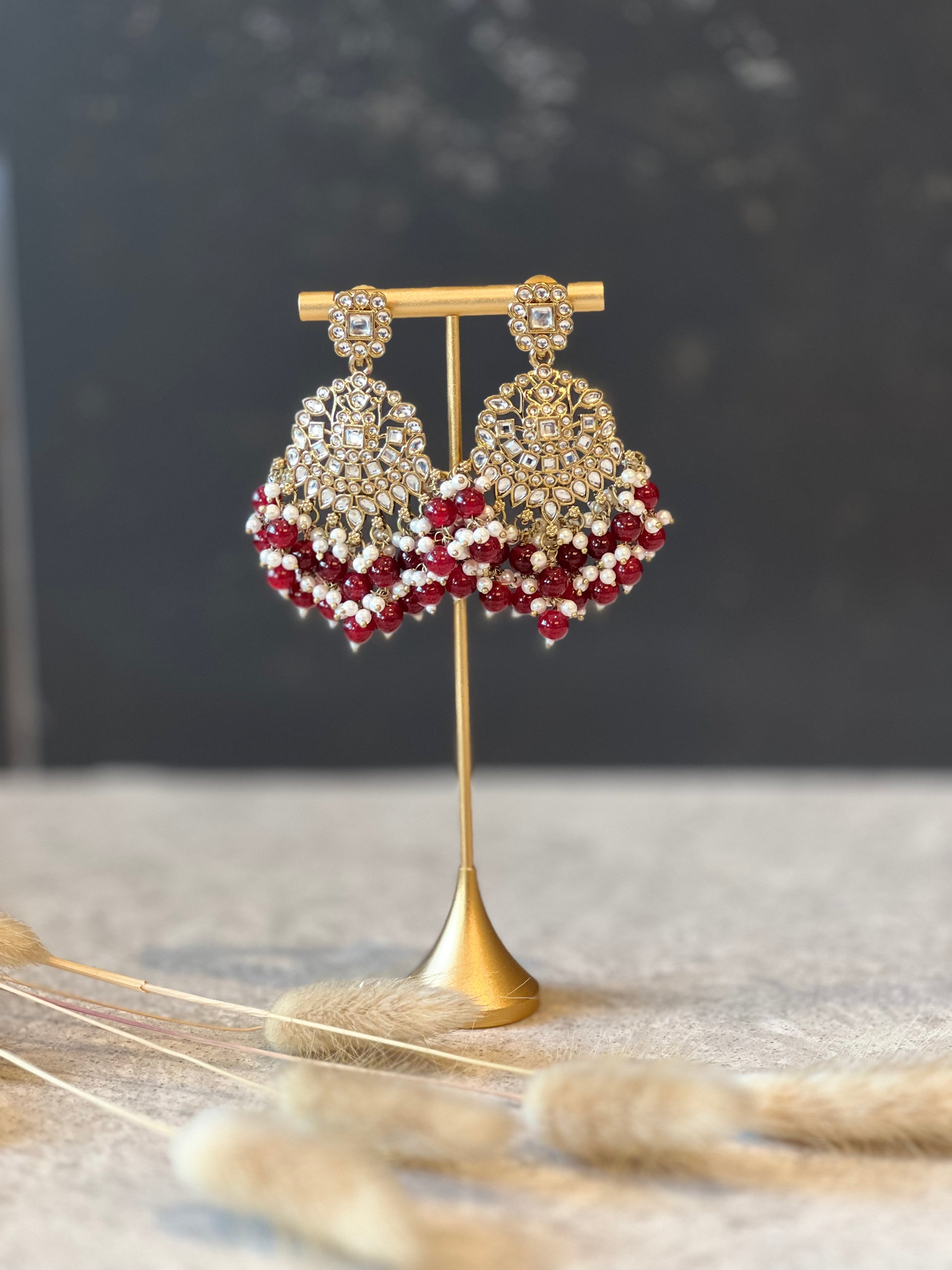 The Inarza Earrings are an artistic take on traditional jhumkas, featuring a kundan-studded base with a central jhumka design. The jhumkas are adorned with delicate teardrop pearls, adding grace and movement. Measuring about 2.7 inches, these earrings are ideal for parties or formal events, offering a sophisticated yet modern look.