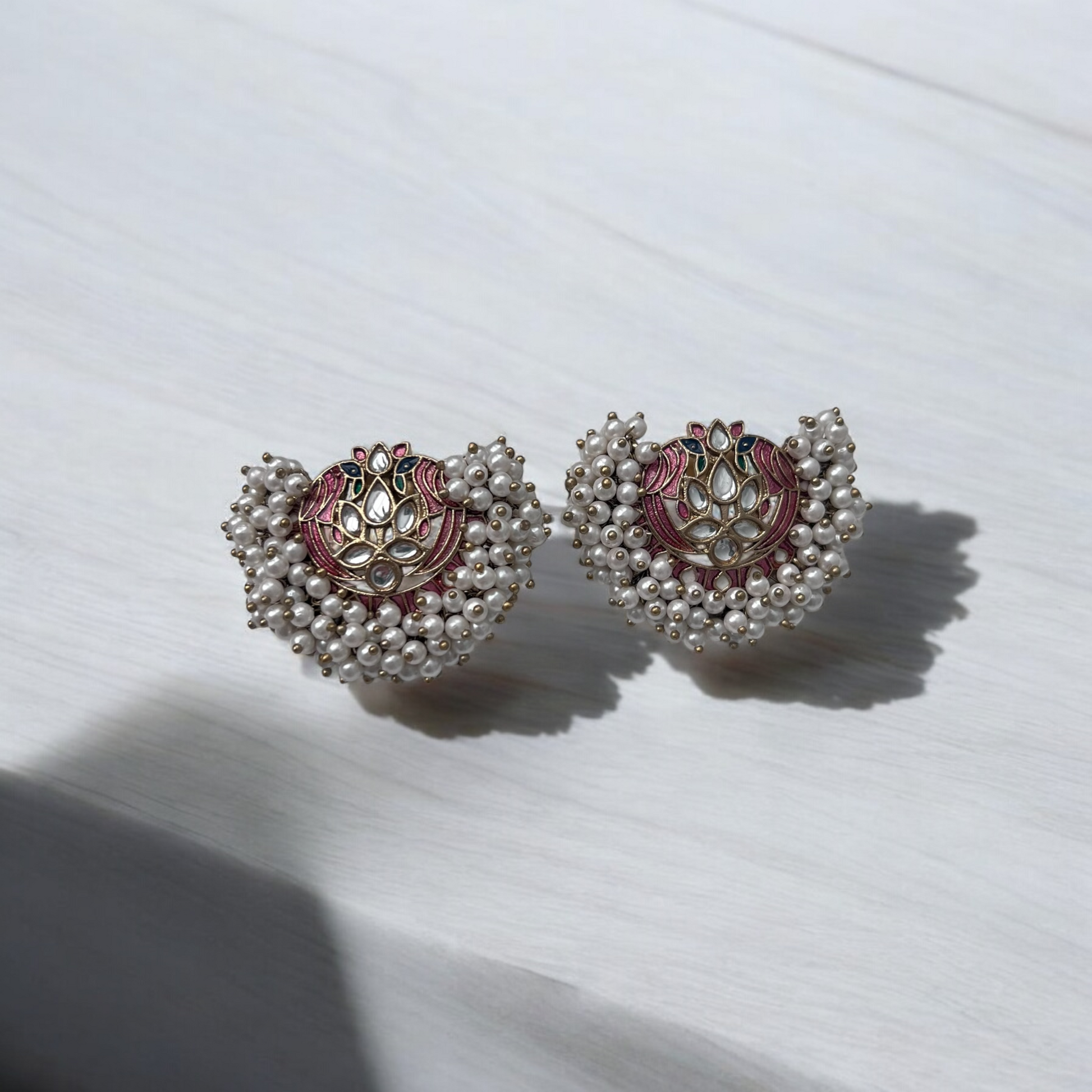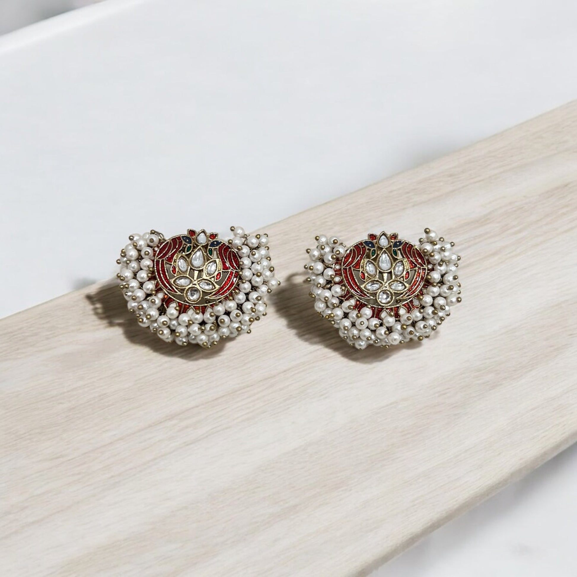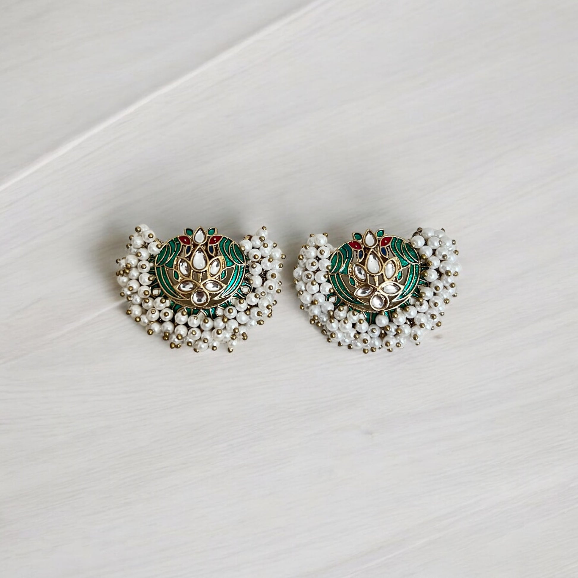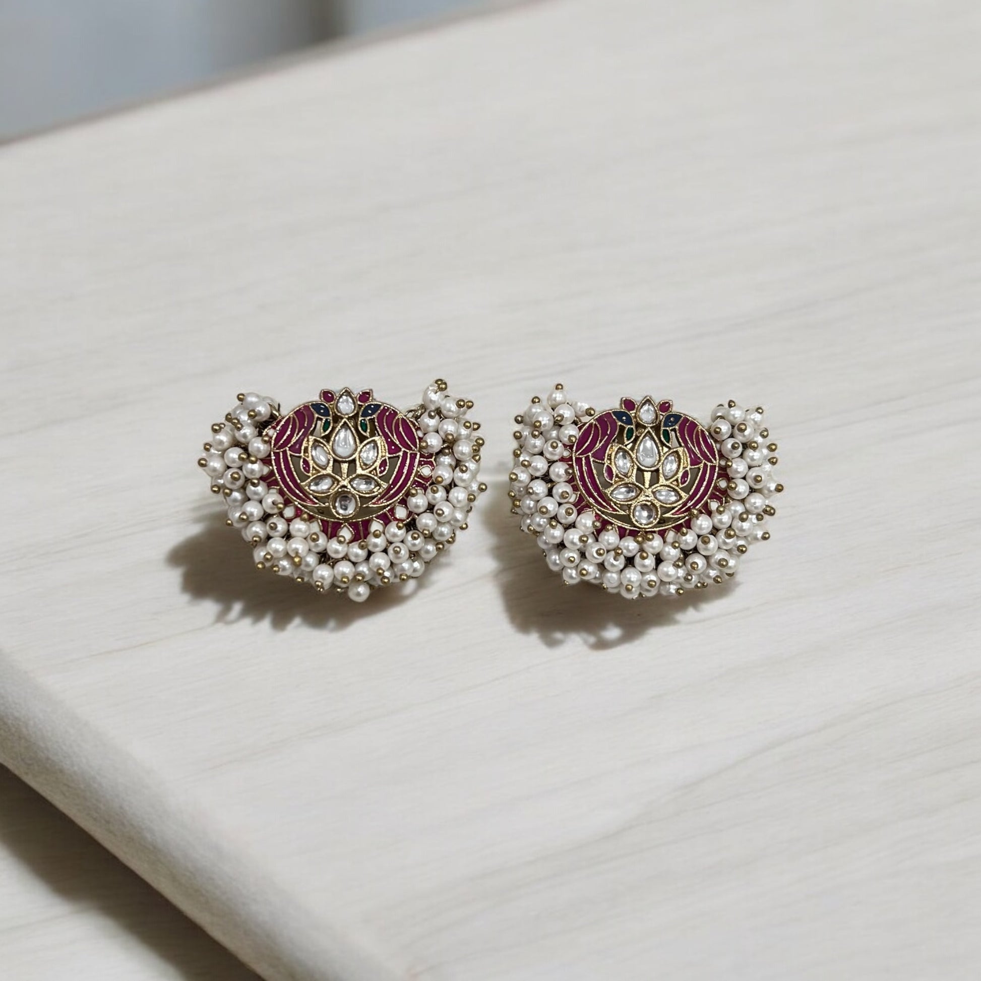 The Meher Earrings feature a breathtaking design with their gold-plated metalwork and bead accents. These chandelier-style earrings have an intricate kundan setting at the top, with meenakari detailing and cascading layers of pearls and beads that add a feminine touch. These earrings are ideal for any occasions where you want to add a soft yet luxurious touch to your ensemble. The delicate color and craftsmanship make them a versatile addition to any jewelry collection.