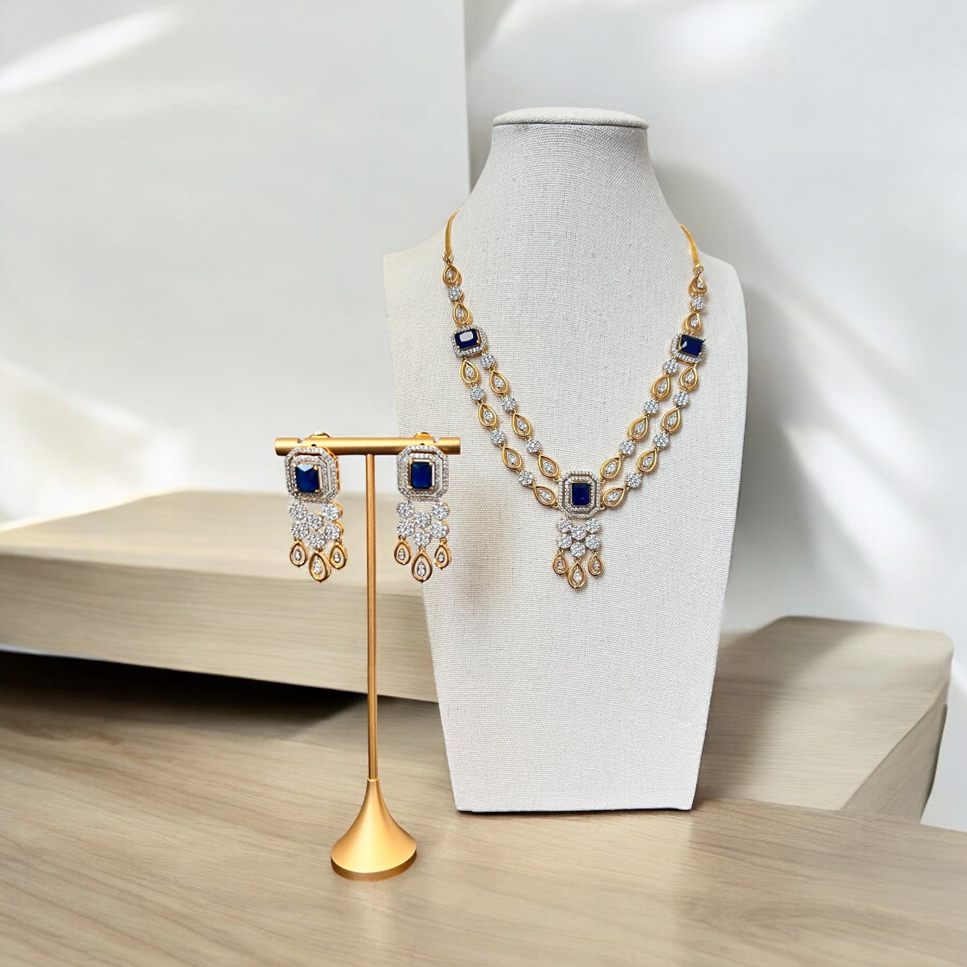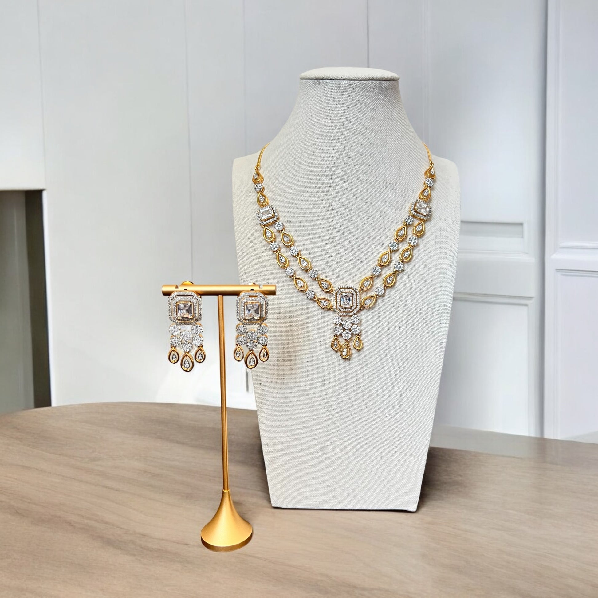 The Zayra Necklace Set is a breathtaking example of traditional craftsmanship with a modern twist. Featuring a double-layered contemporary style necklace with sparkling stones and intricate detailing, this set exudes luxury and sophistication. The accompanying earrings are equally stunning, and mirroring the intricate design of the necklace. Perfect for formal wear or events, this set adds a touch of timeless elegance to any ensemble.