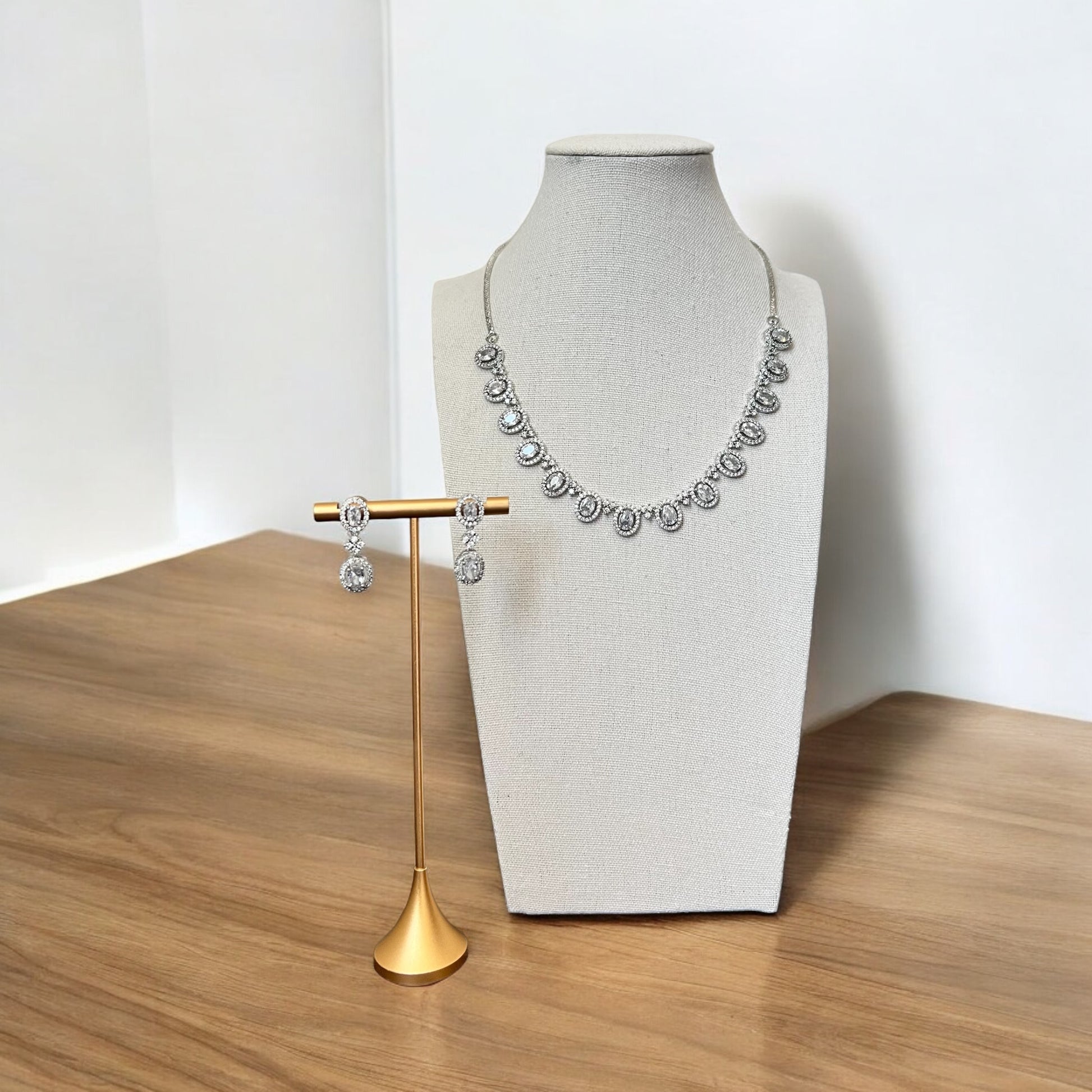 The Leena Necklace Set features a minimalist yet elegant design. A delicate chain of sparkling cubic zirconia stones leads to a central teardrop-shaped pendant, creating a look of understated luxury. The set includes matching earrings, each with a 1.5-inch drop, featuring the same teardrop design. Perfect for both formal and casual events, the Leena set offers versatility and elegance, making it a go-to choice for any jewelry collection.